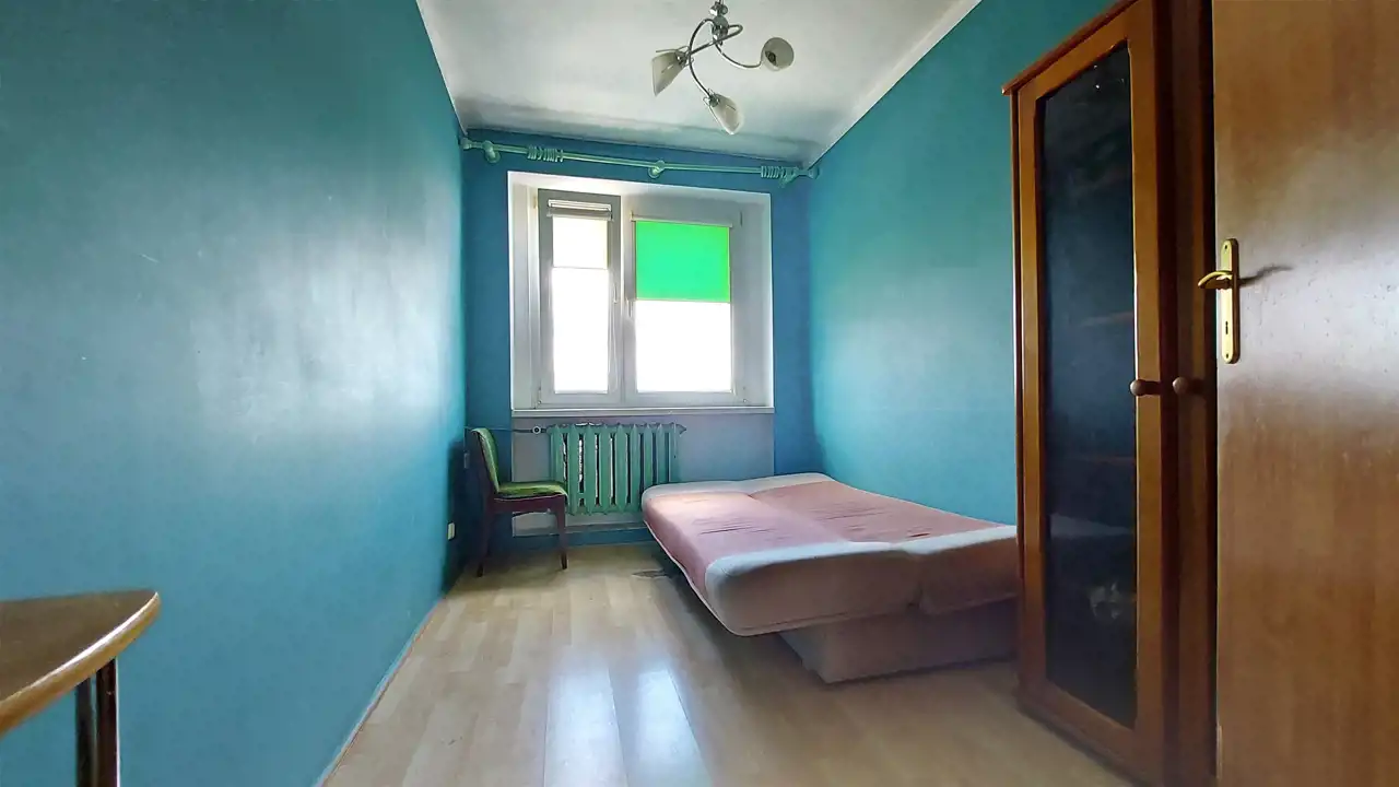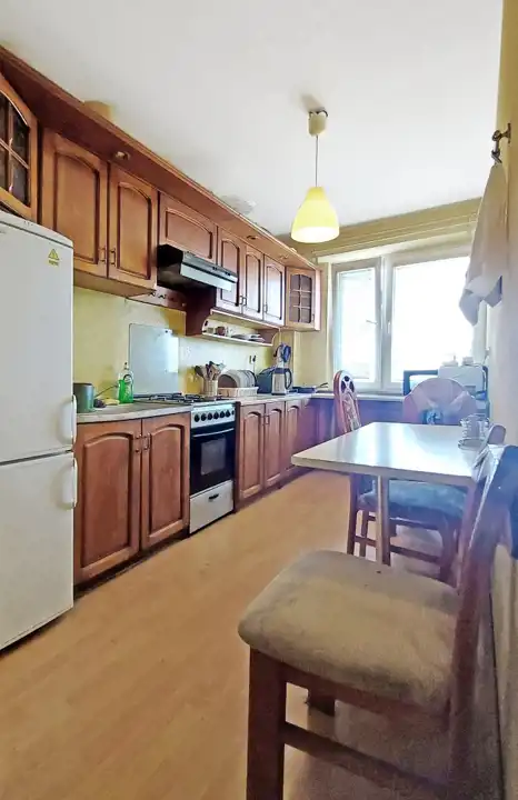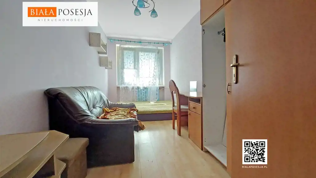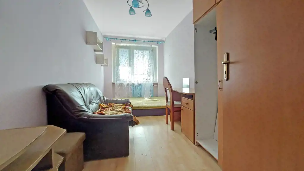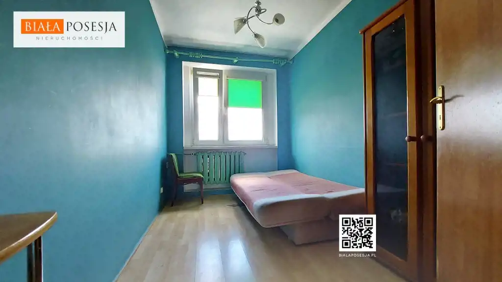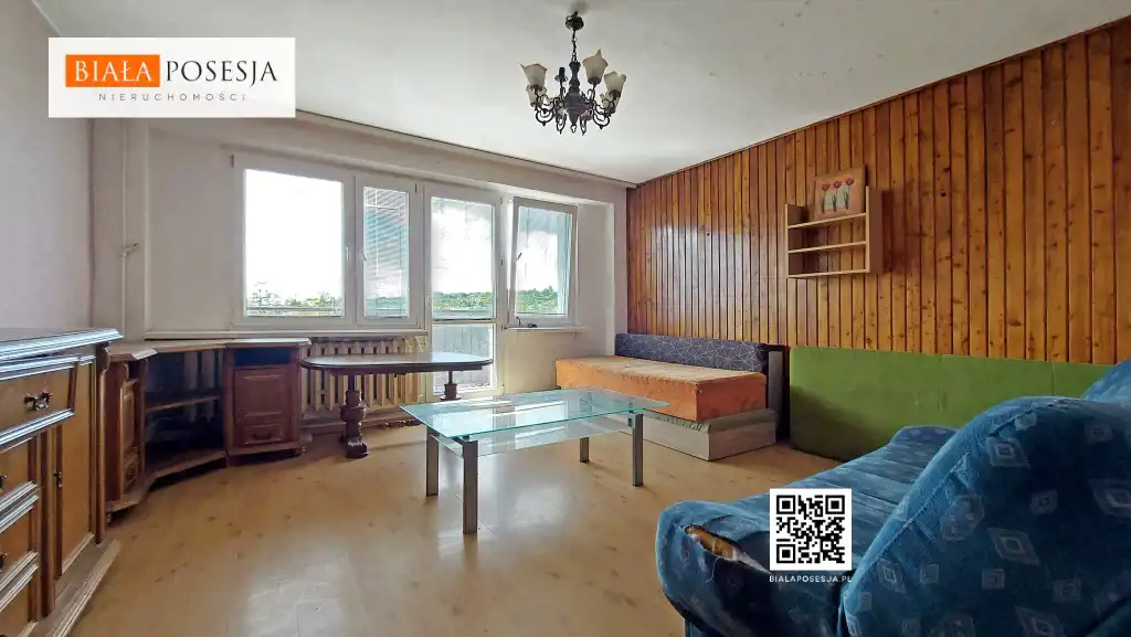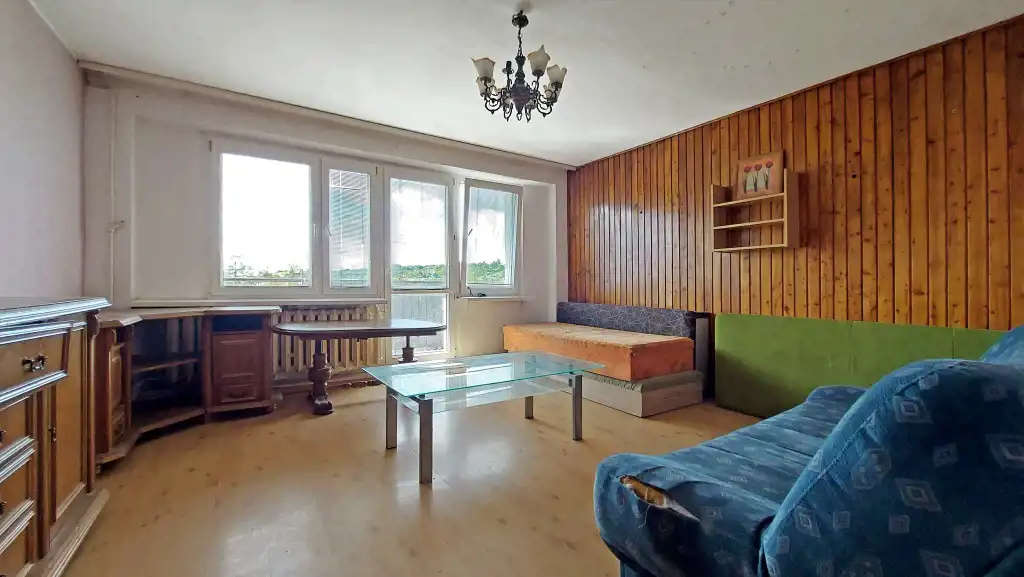 Wnętrze wymaga remontu, co stwarza duże możliwości aranżacyjne. Największy pokój z wyjściem na balkon typu loggia od strony zachodniej zapewnia przyjemne miejsce do wypoczynku. Wszystkie pomieszczenia są dobrze doświetlone — ekspozycja wschód-zachód, co gwarantuje naturalne światło przez cały dzień. Kuchnia posiada dostęp do światła dziennego, co dodatkowo podnosi komfort codziennego użytkowania.