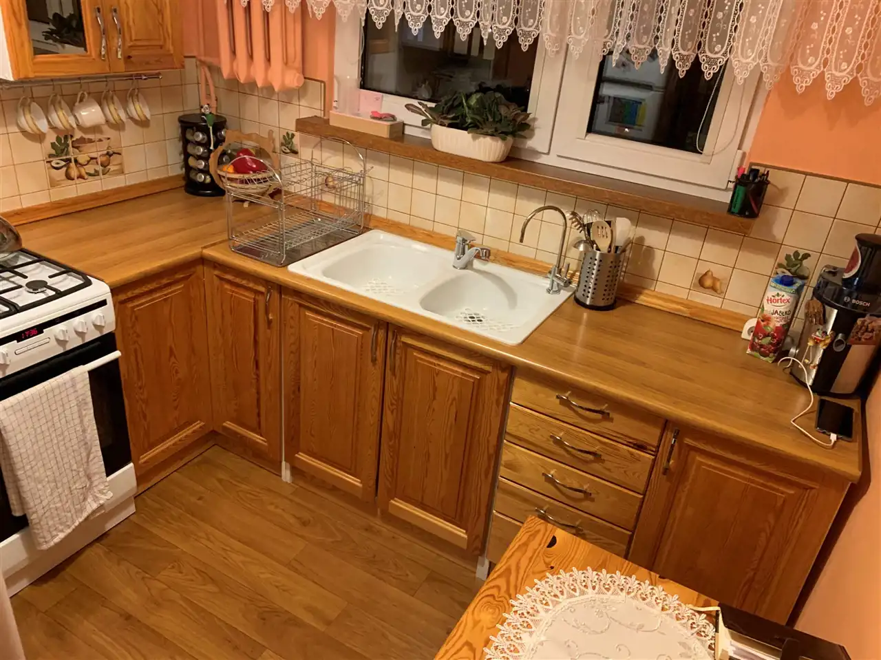 KUCHNIA O POW. 4,8M2. - meble w zabudowie robione na zamówienie z sosny, okna PCV, lodówka, kuchenka z piekarnikiem, pochłaniacz pary, pas roboczy płytki.