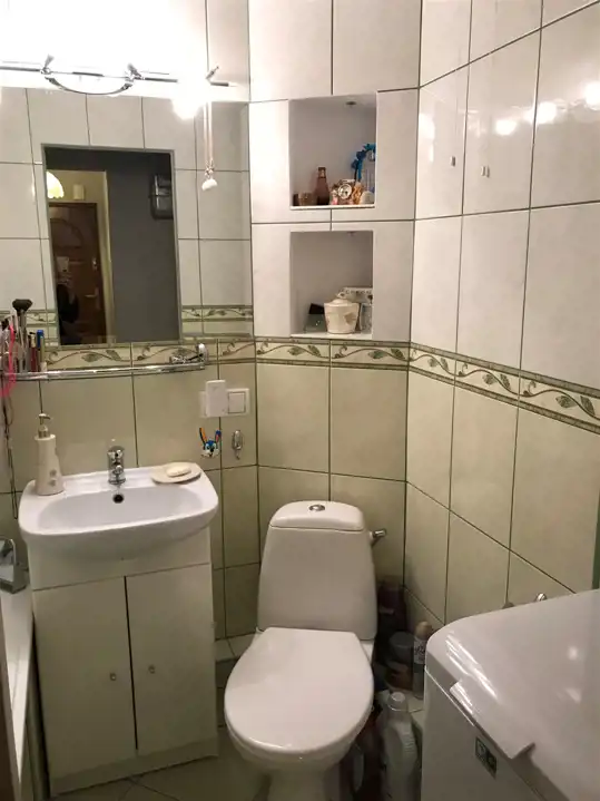 ŁAZIENKA Z WC - O POW. 2,7M2. - wanna, szafka, umywalka, miejsce na pralkę, półki, glazura i terakota.