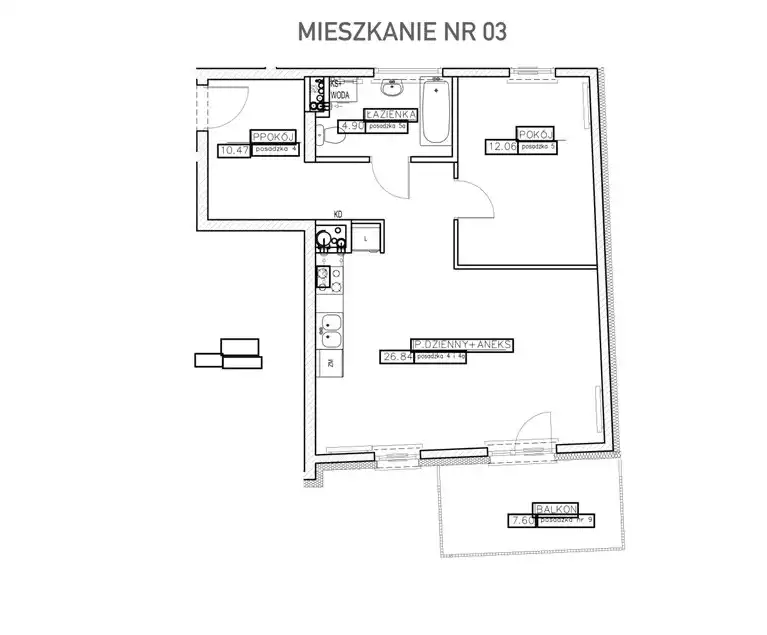 - pokoju z aneksem kuchennym (26,84m2) z wyjściem na balkon (7,60m2),