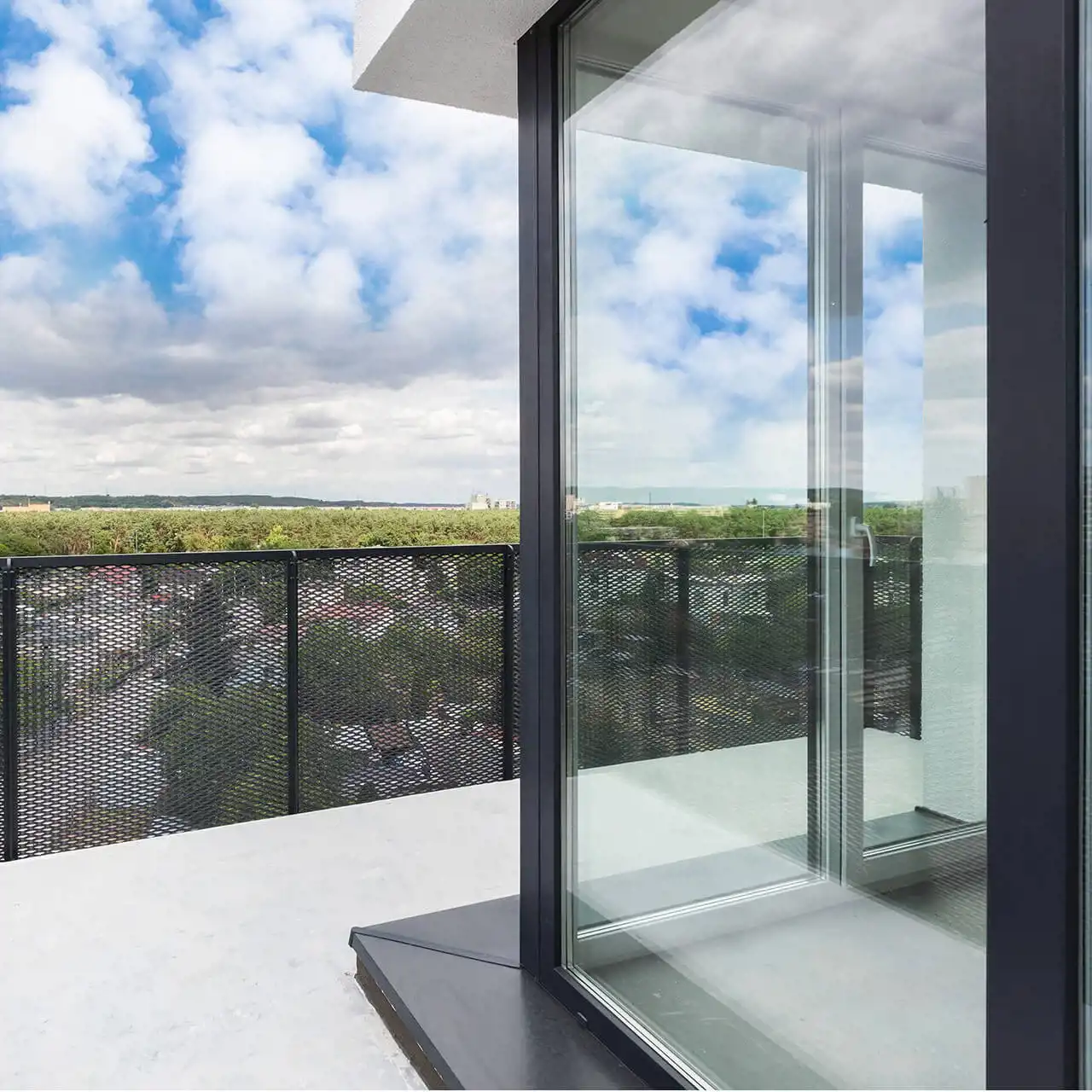 Balkon wykończony balustradą zapewniającą prywatność.