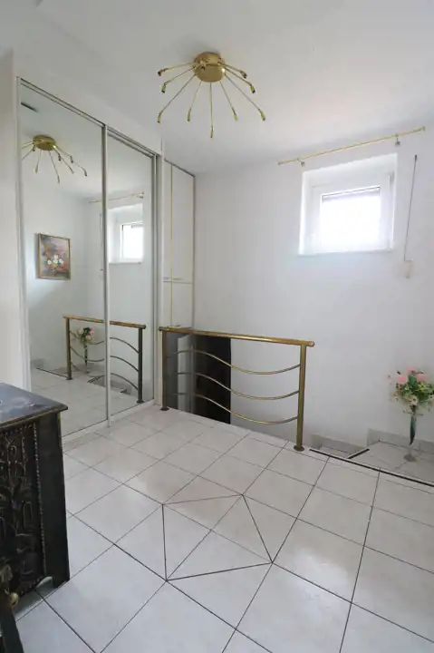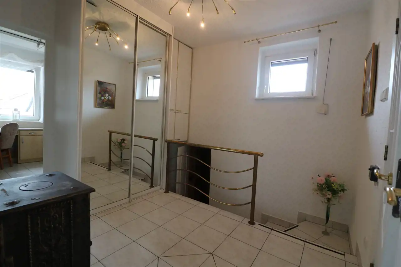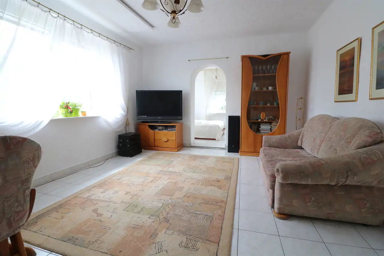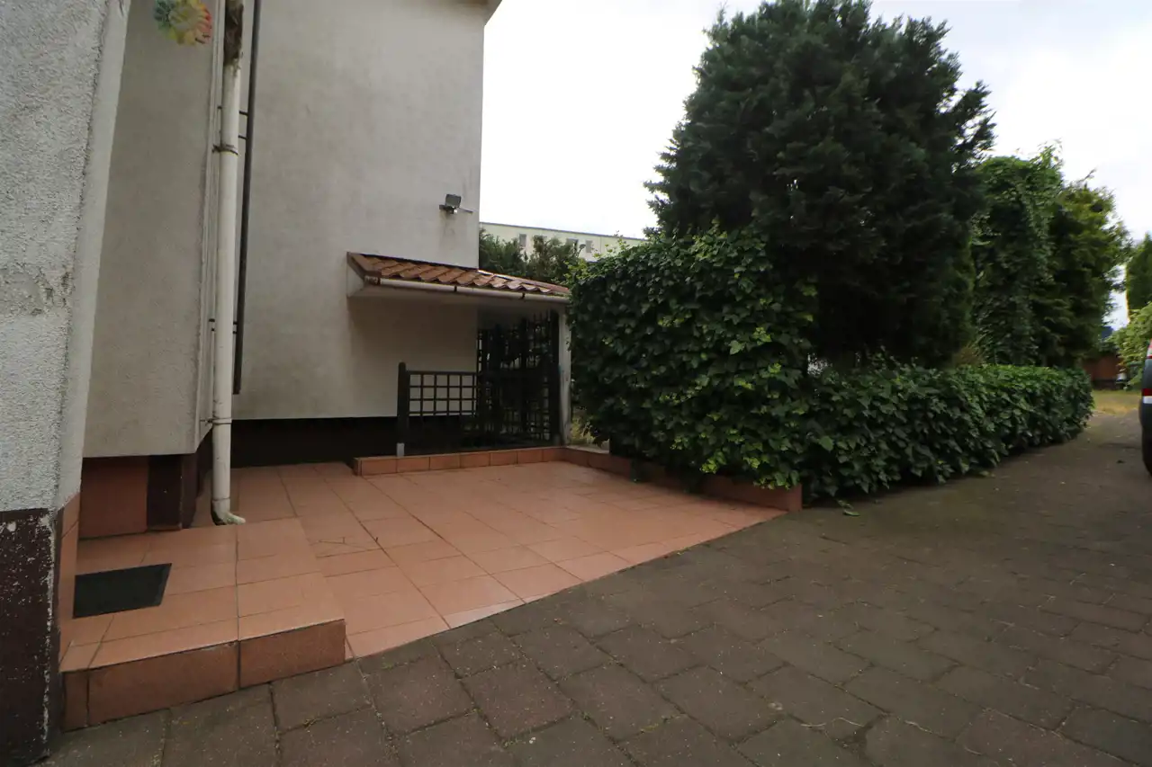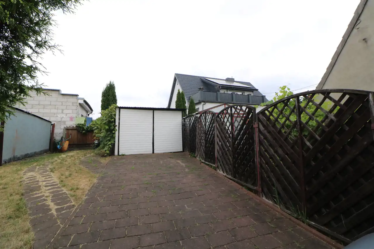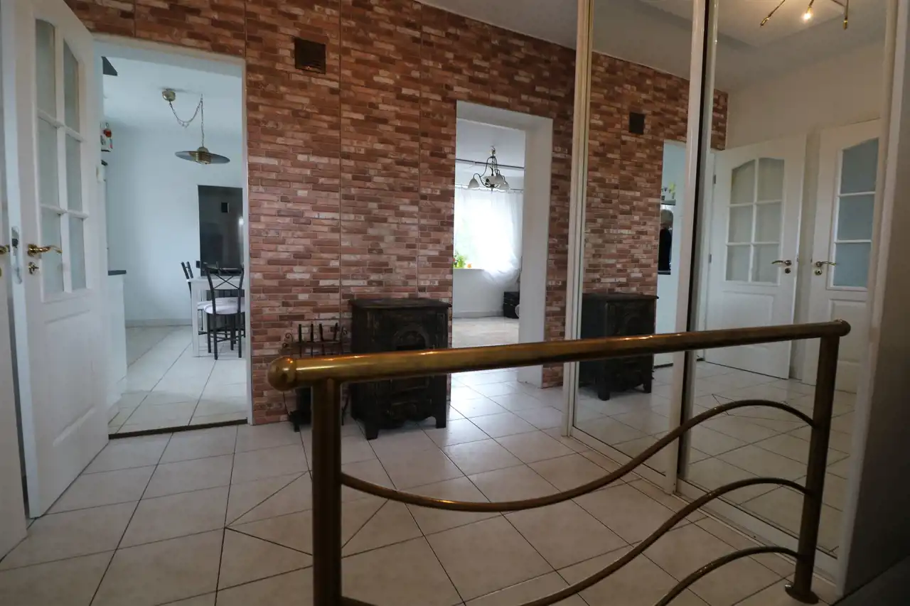 Do mieszkania przynależą dwa garaże, jeden w bryle budynku z kanałem wraz z dodatkowym pomieszczeniem, drugi blaszany oraz dwa pomieszczenia gospodarcze. Łączna powierzchnia lokalu mieszkalnego wraz z powierzchnią pomieszczeń przynależnych wynosi 113,1 m2.
