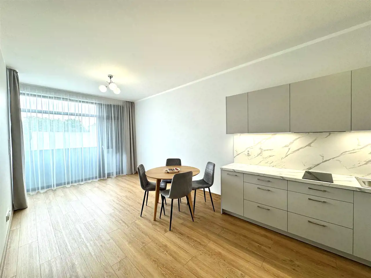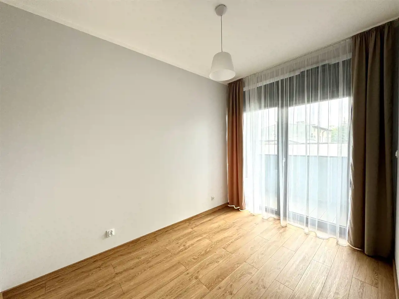 • salon z aneksem kuchennym i wyjściem na balkon,