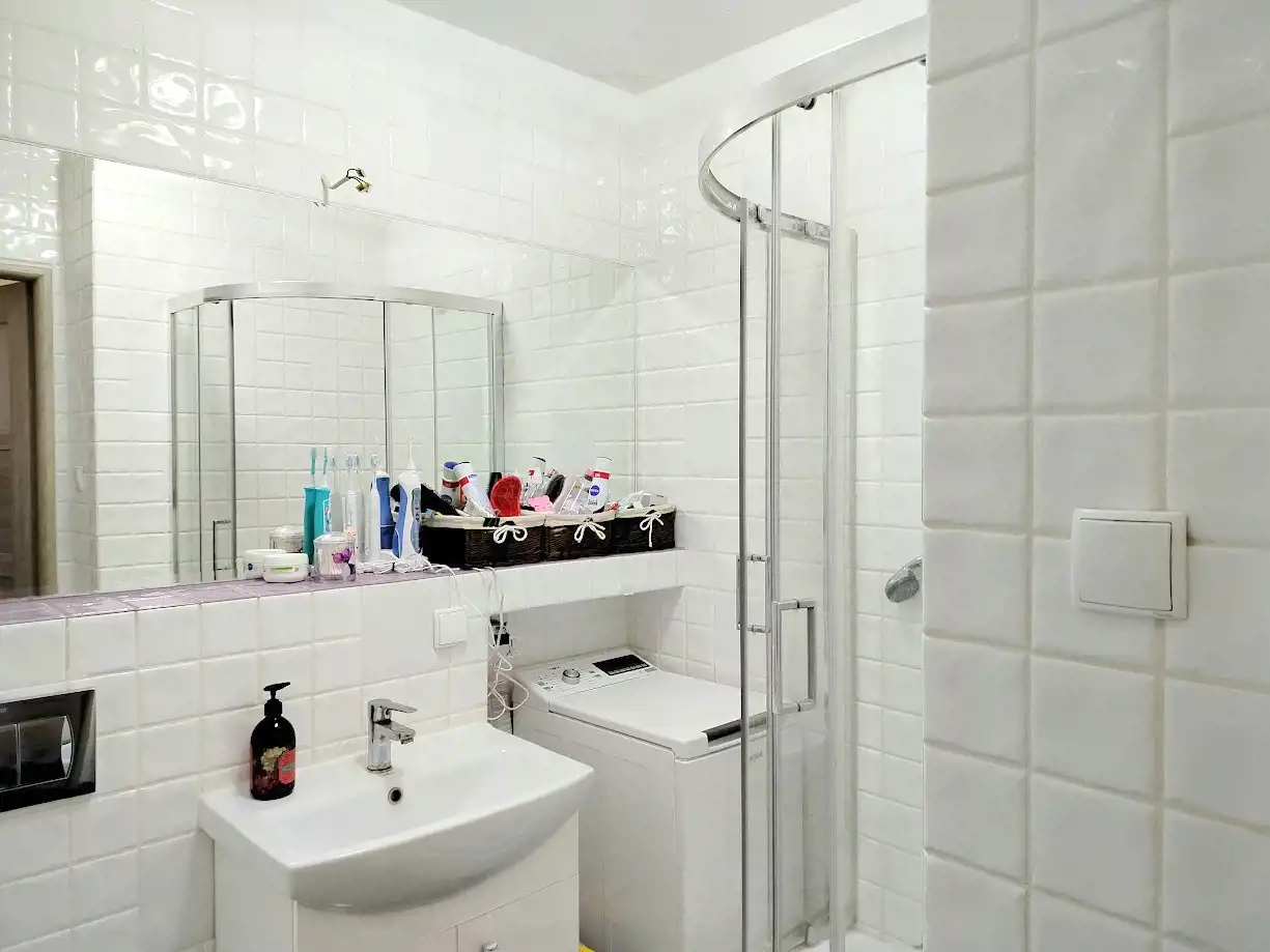 Łazienka wykończona ładnymi białymi kaflami, z kabiną prysznicową i pralką.