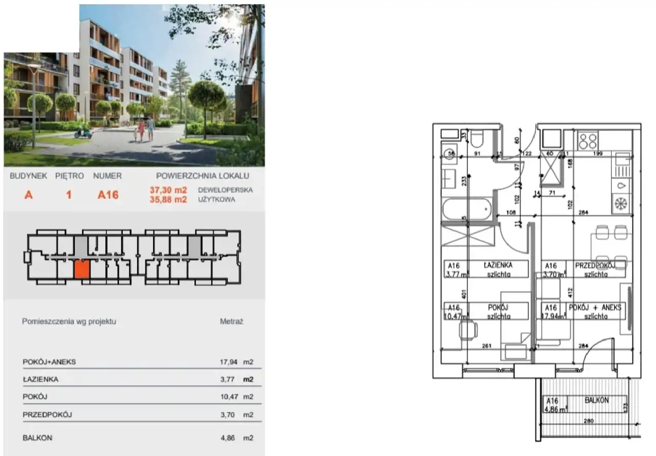 - Charakterystyka mieszkania 36.62 m2, 2 pokoje