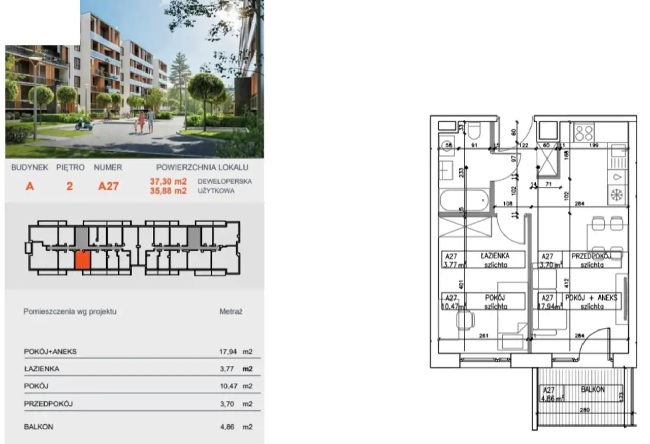 - Charakterystyka mieszkania 36.62 m2, 2 pokoje