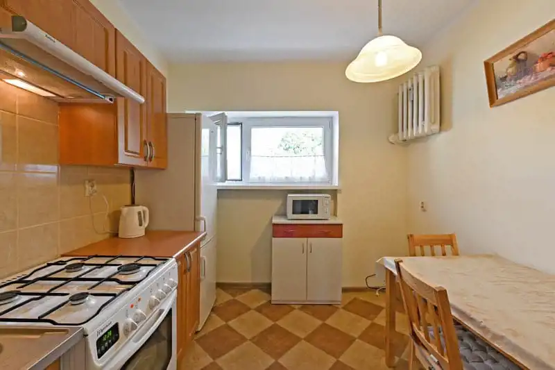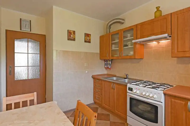Kuchnia w kafelkach, umeblowana i wyposażona w sprzęt AGD.