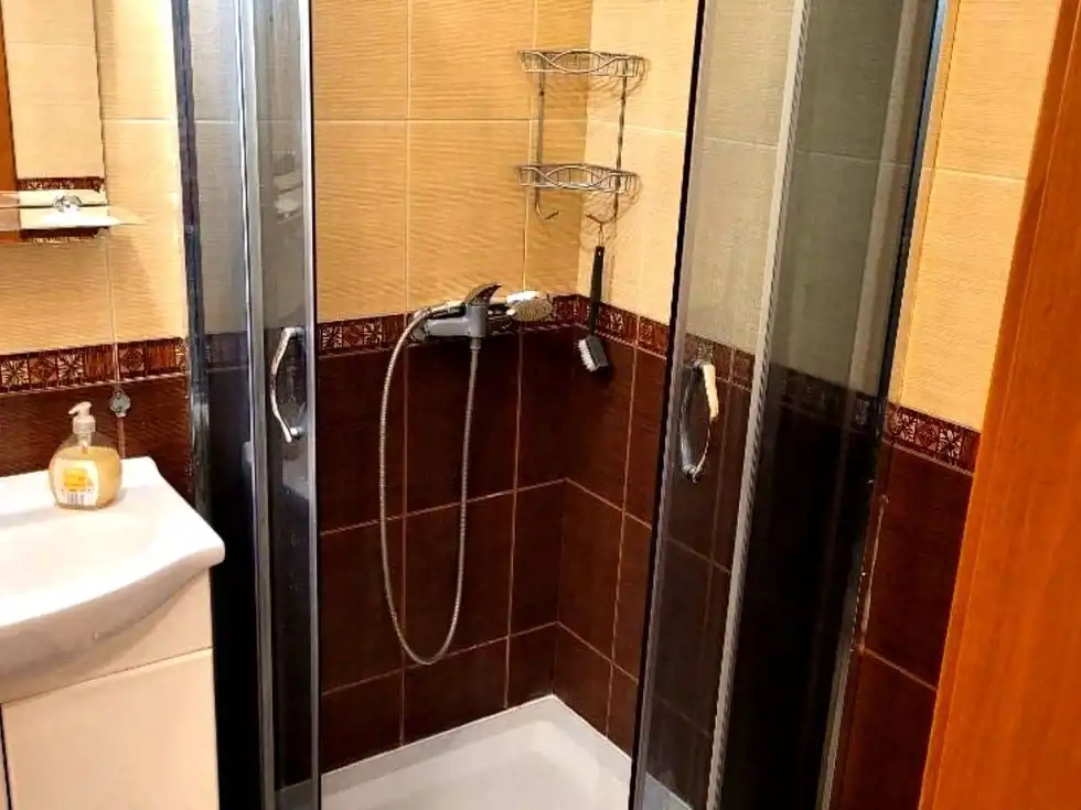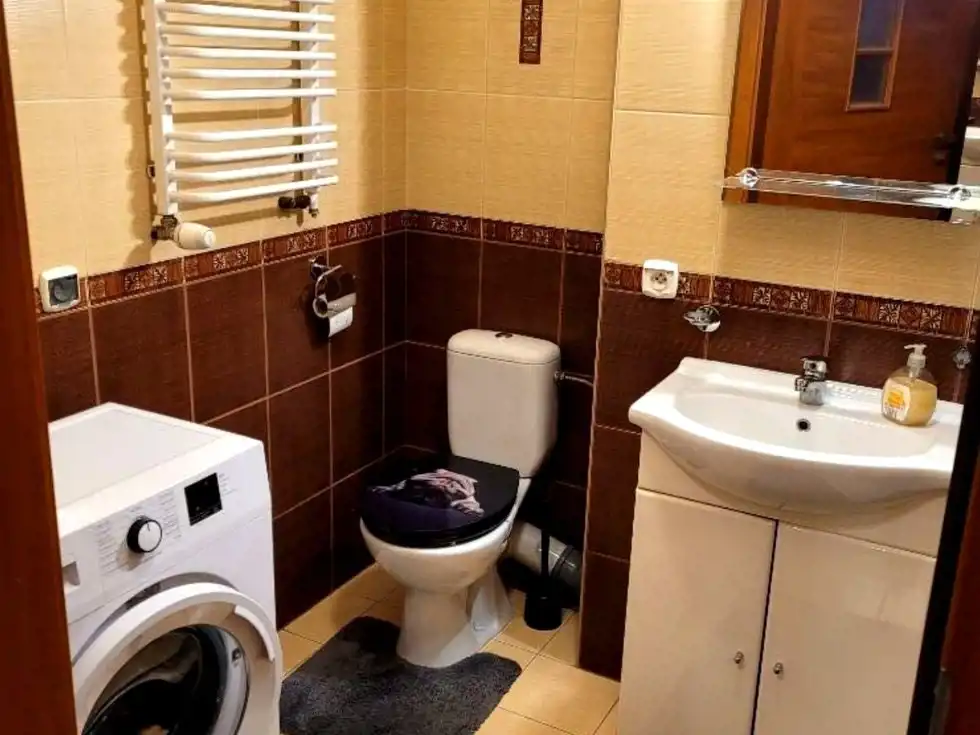 – łazienka w kaflach z prysznicem, pralką i pełnym wyposażeniem