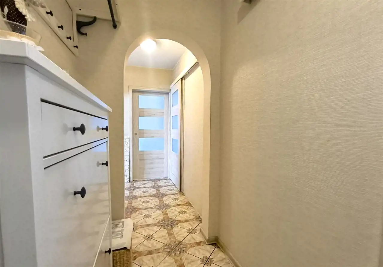 Serce mieszkania stanowi połączony salon z kuchnią, które razem zajmują 21 m². Dzięki sprytnemu rozkładowi, kuchnia została dyskretnie ukryta, co pozwala na wspólne spędzanie czasu z rodziną podczas przygotowywania posiłków. Łazienka z WC oraz przedpokój z zabudowaną szafą dopełniają funkcjonalny układ mieszkania, a przesuwny system drzwi wewnętrznych pozwala zaoszczędzić cenną przestrzeń.