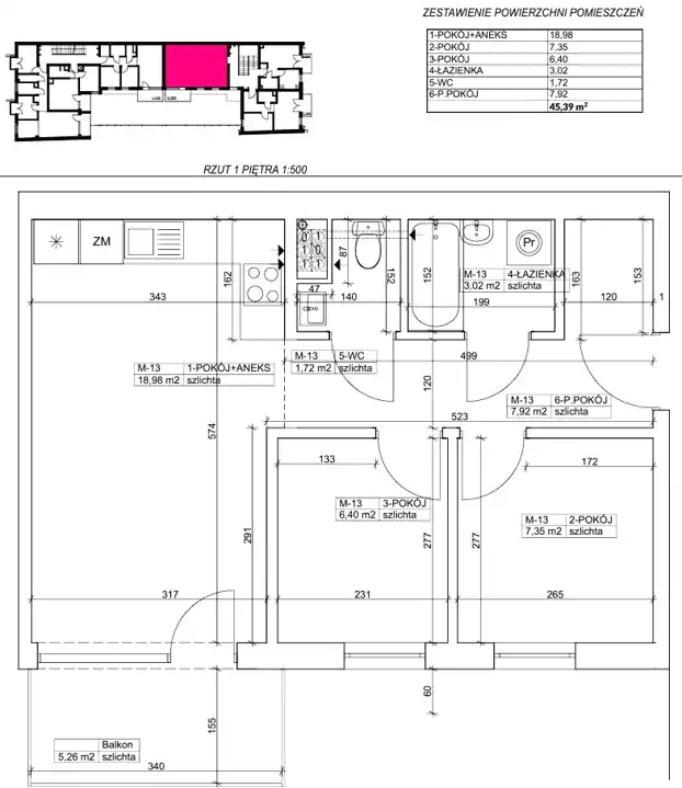 - Charakterystyka mieszkania 45.39 m2, 3 pokoje