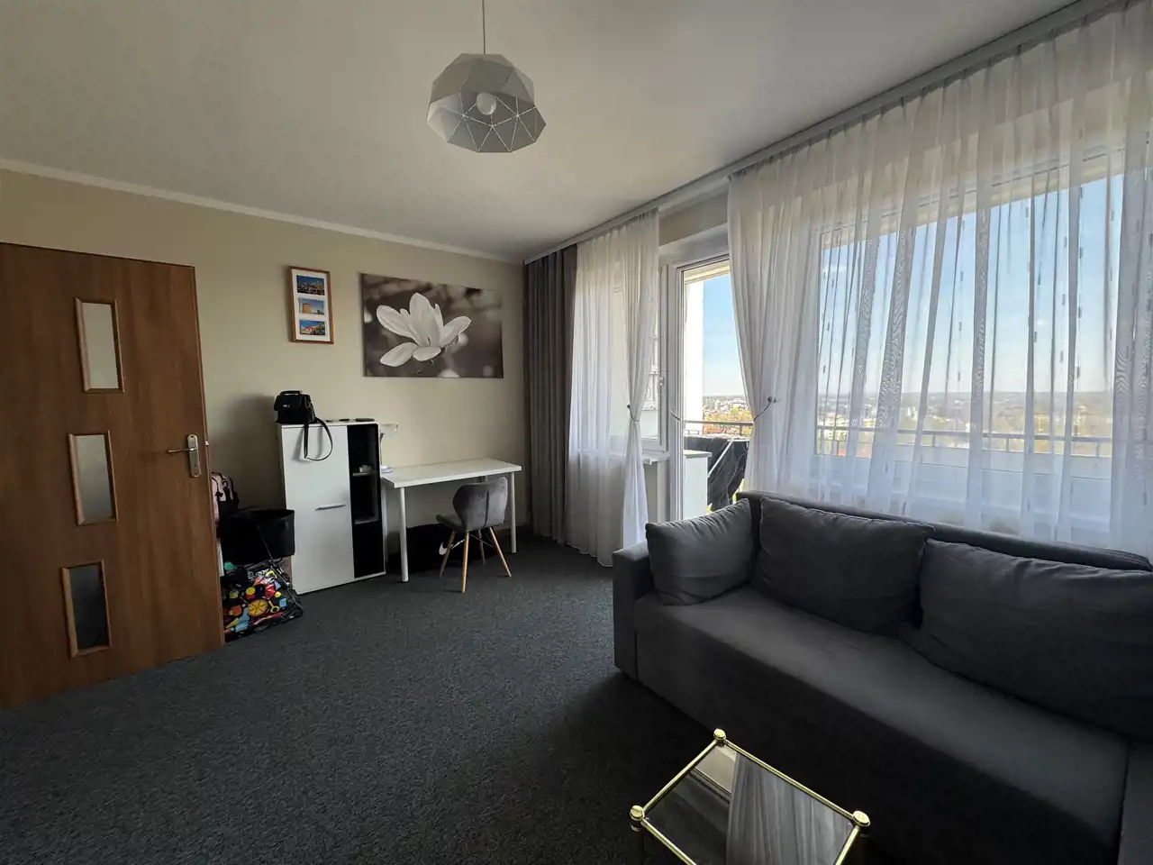 Mieszkanie jest dwustronne, jasne i dobrze doświetlone, a jego dużym atutem jest balkon typu loggia z pięknym widokiem na panoramę miasta. Budynek wyposażony jest w nową windę, a klatka schodowa jest obecnie w trakcie remontu.