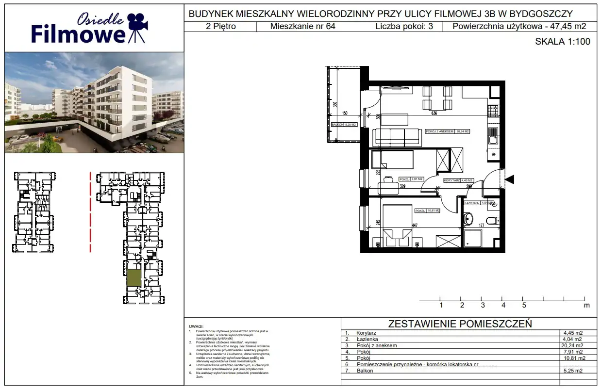 - Charakterystyka mieszkania 47.45 m2, 3 pokoje