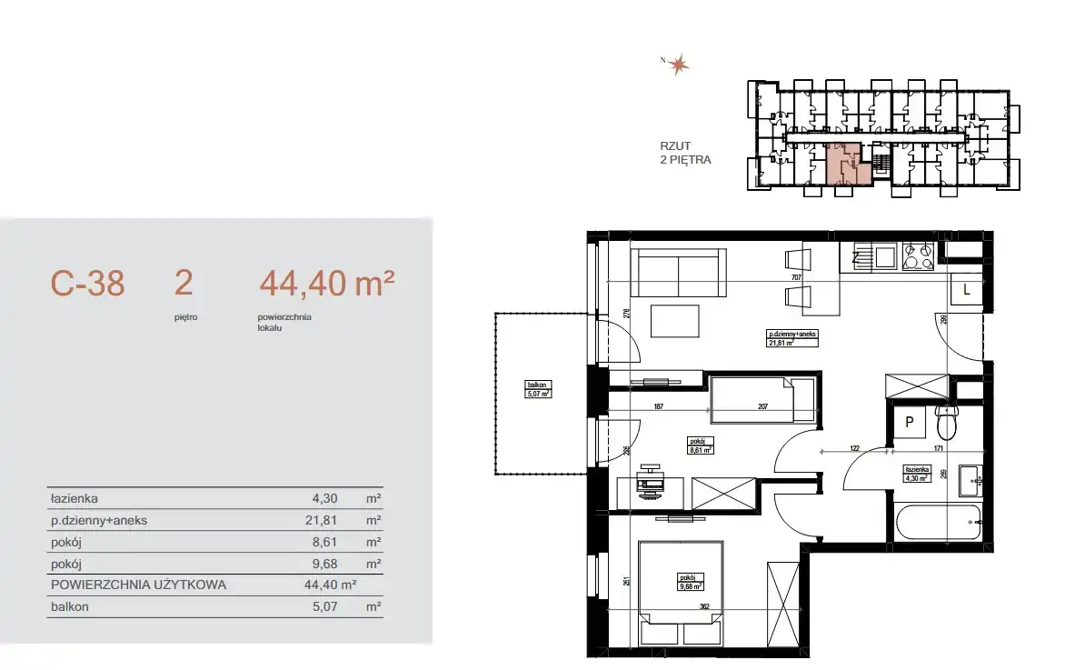 - Charakterystyka mieszkania 44.4 m2, 3 pokoje