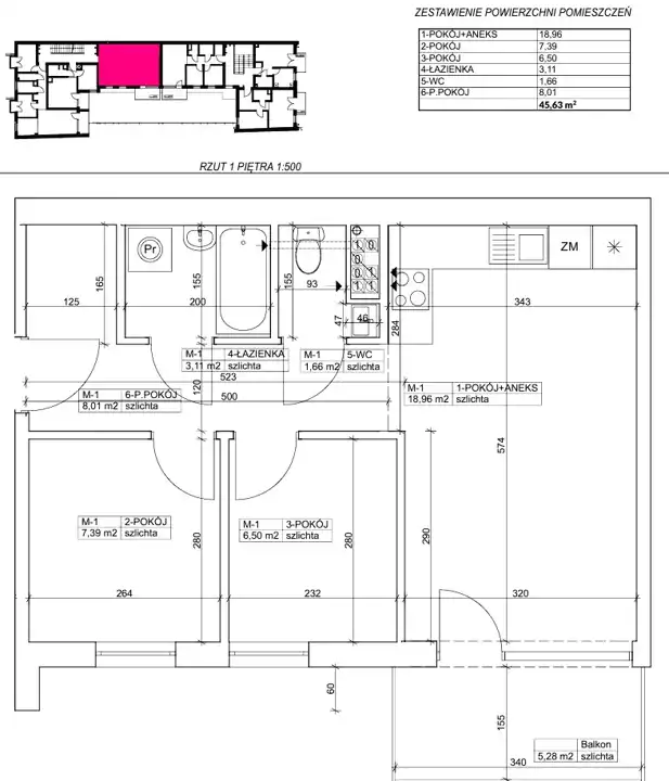 - Charakterystyka mieszkania 45.63 m2, 3 pokoje