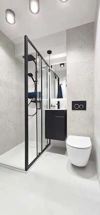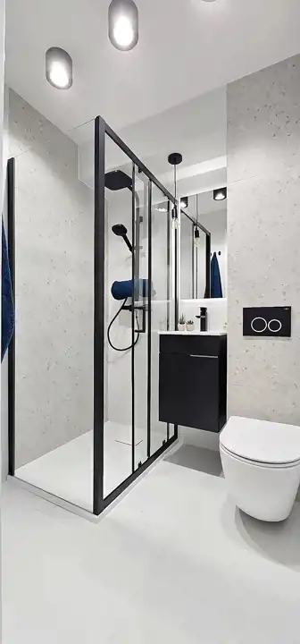 Elegancka łazienka z prysznicem – wykończona w nowoczesnym, uniwersalnym stylu i w pełni wyposażona,