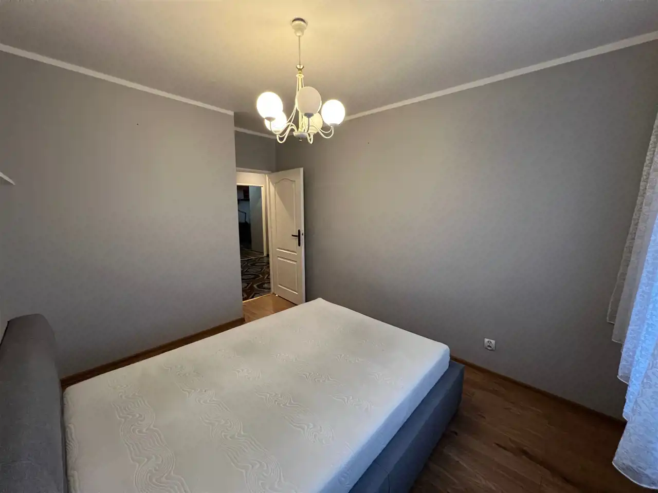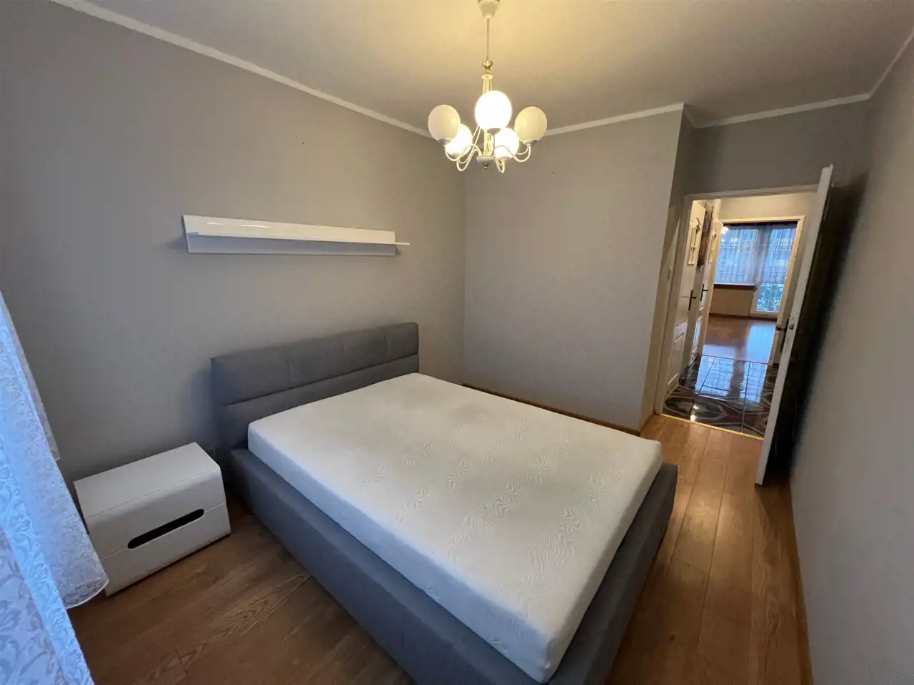 Wyposażenie w cenie: Zabudowa kuchenna (lakierowany biały mat) wraz ze sprzętem AGD (lodówka, piekarnik, płyta gazowa, pochłaniacz), narożnik, komody oraz duże łóżko w sypialni.