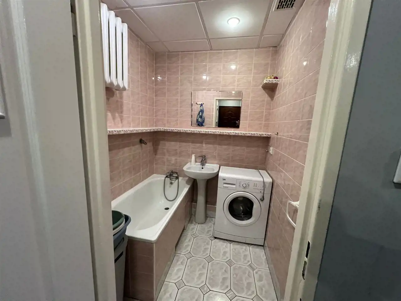 - Łazienka nr 1: Wyposażona w wannę, pralkę oraz umywalkę.