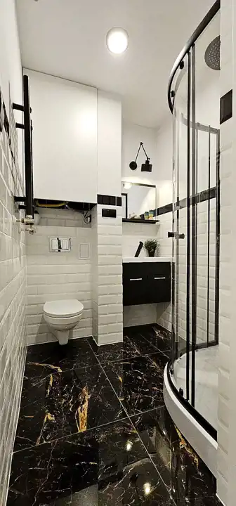 kompletnie urządzoną łazienkę (kabina prysznicowa, szafka, lustro),