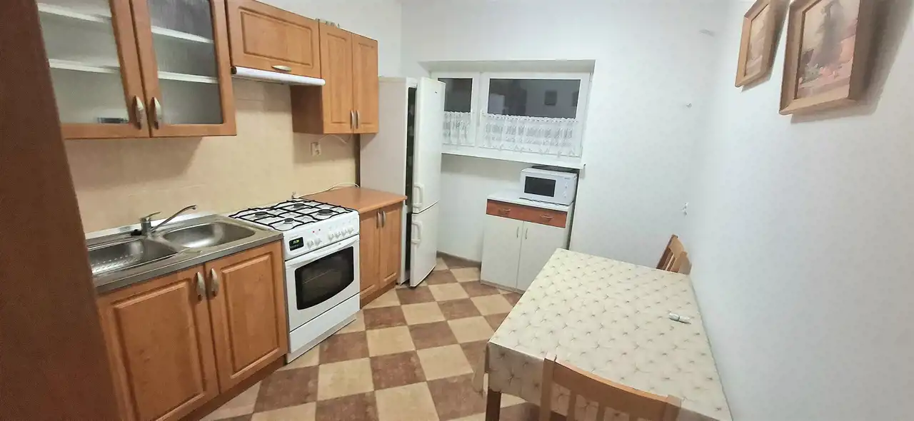 Kuchnia w kafelkach, umeblowana i wyposażona w sprzęt AGD.
