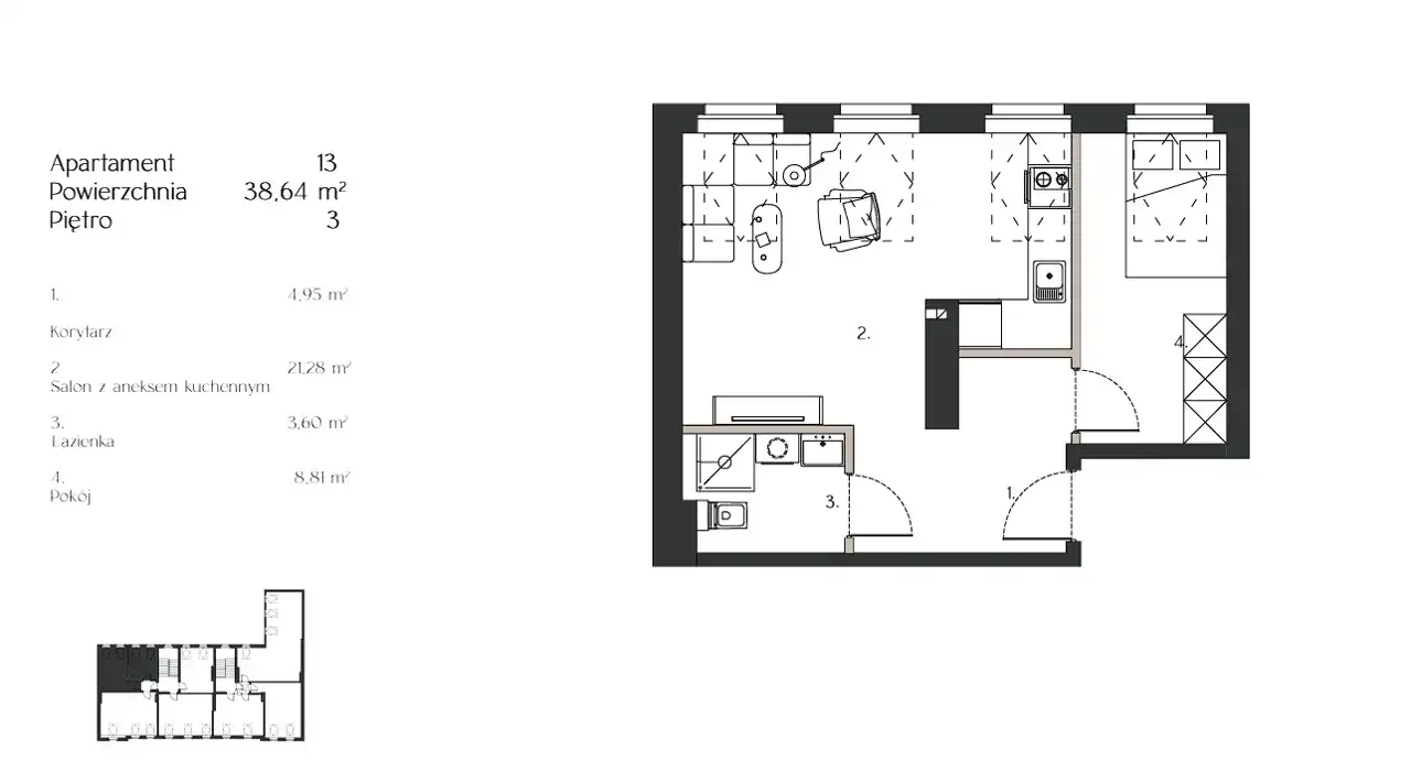 Układ składa się z salonu z aneksem kuchennym, sypialni i łazienki.