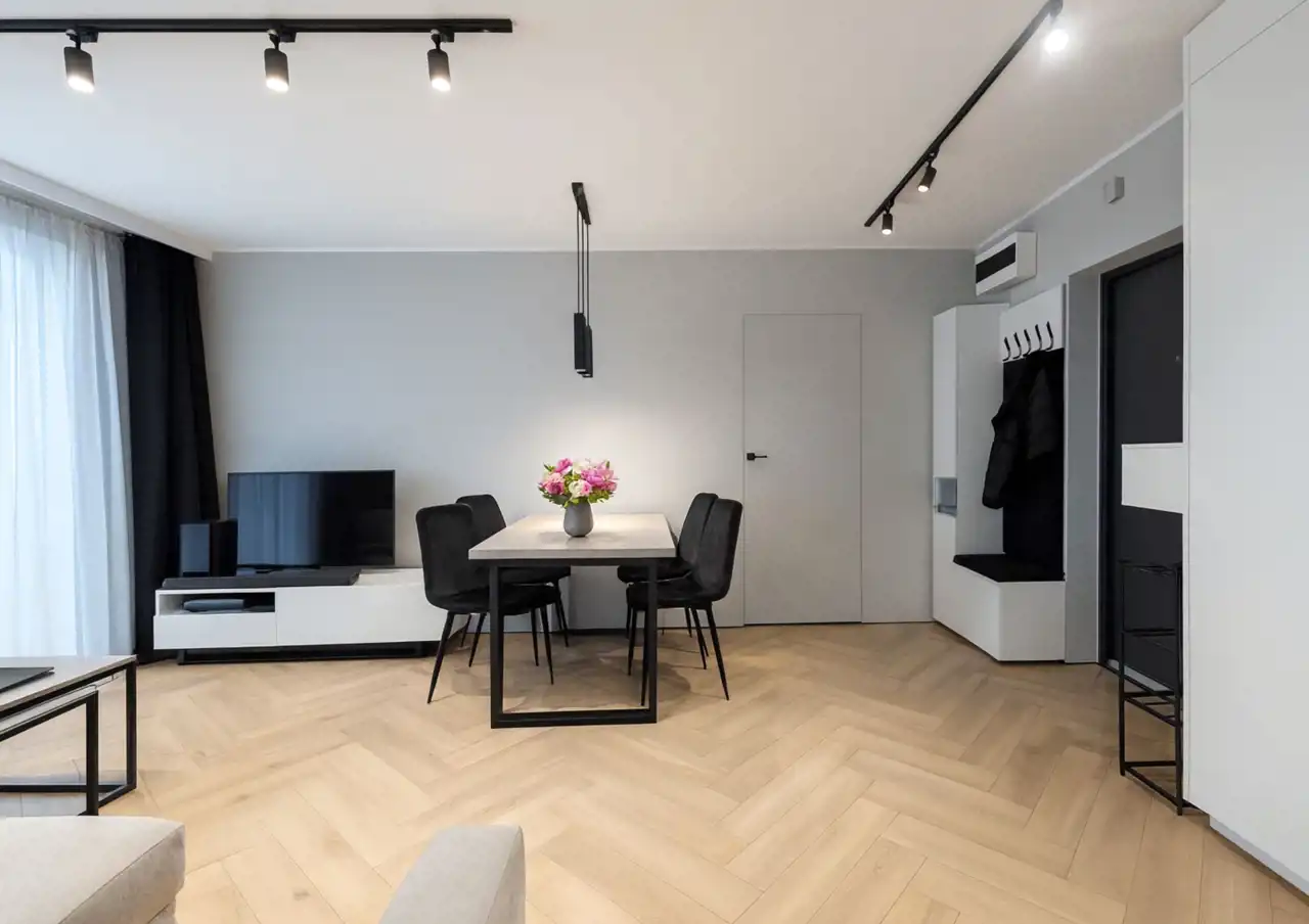 Zastosowano inteligentne oświetlenie oraz zdalnie sterowane zasłony, które podnoszą komfort codziennego użytkowania. Sprzęty kuchenne i łazienkowe objęte są jeszcze półroczną gwarancją.