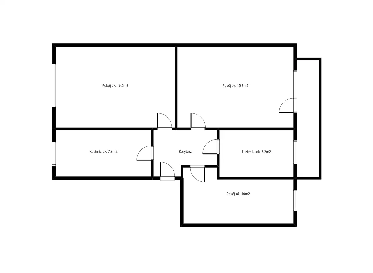 7. Wszystkie pomieszczenia są niezwykle ustawne i przestronne – metraż pokoi to około 16,60m2, 15,80m2, 10m2, kuchnia ma około 7,30m2, a łazienka około 5,2m2.
