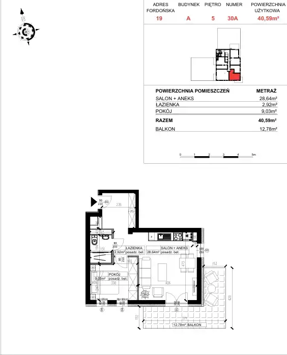 - Charakterystyka mieszkania 40.59 m2, 2 pokoje