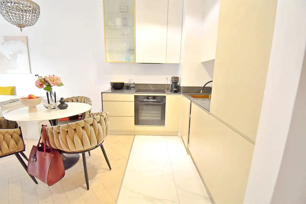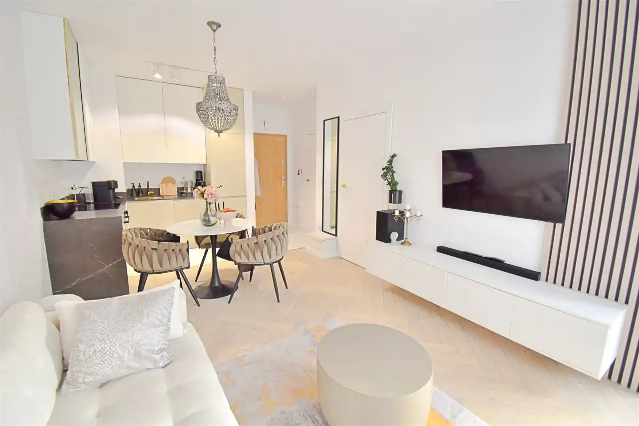 - Salon z aneksem kuchennym: w pełni umeblowany, wygodny aneks wyposażony w nowoczesny sprzęt AGD w zabudowie Bosch i Samsung, blaty robocze z ultra trwałego konglomeratu, część wypoczynkowa z oknami do podłogi i wyjściem na duży zadaszony balkon z ekspozycją na południowy zachód (piękne zachody słońca)