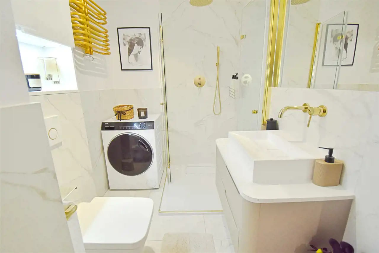 - niewielka ale bardzo funkcjonalna łazienka: duży prysznic z deszczownicą, ceramika Villeroy&Boch, nowoczesna złota armatura, pralko-suszarka Haier