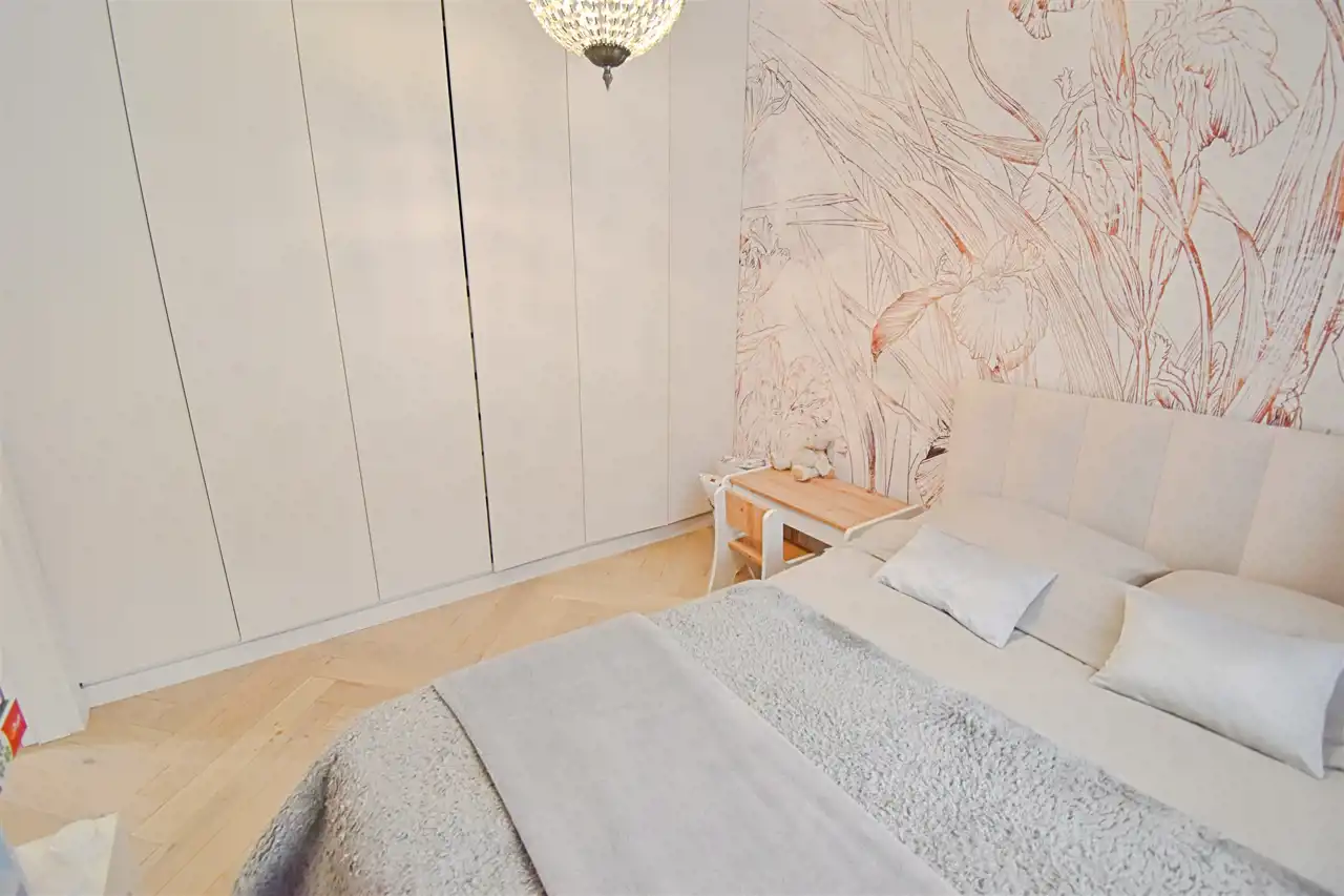 - Sypialnia w pełni wyposażona: podwójne łóżko, szafa garderobiana na cala szerokość pokoju i designerski regał tworzą przytulne i wygodne miejsce odpoczynku.