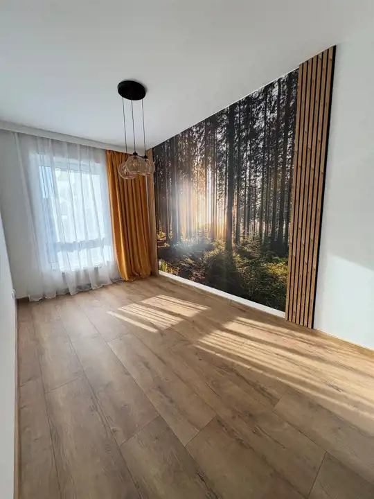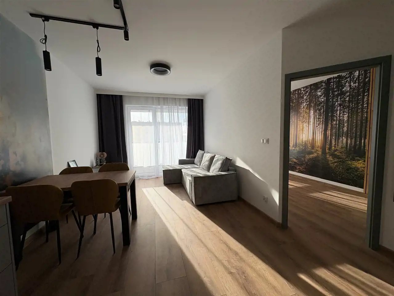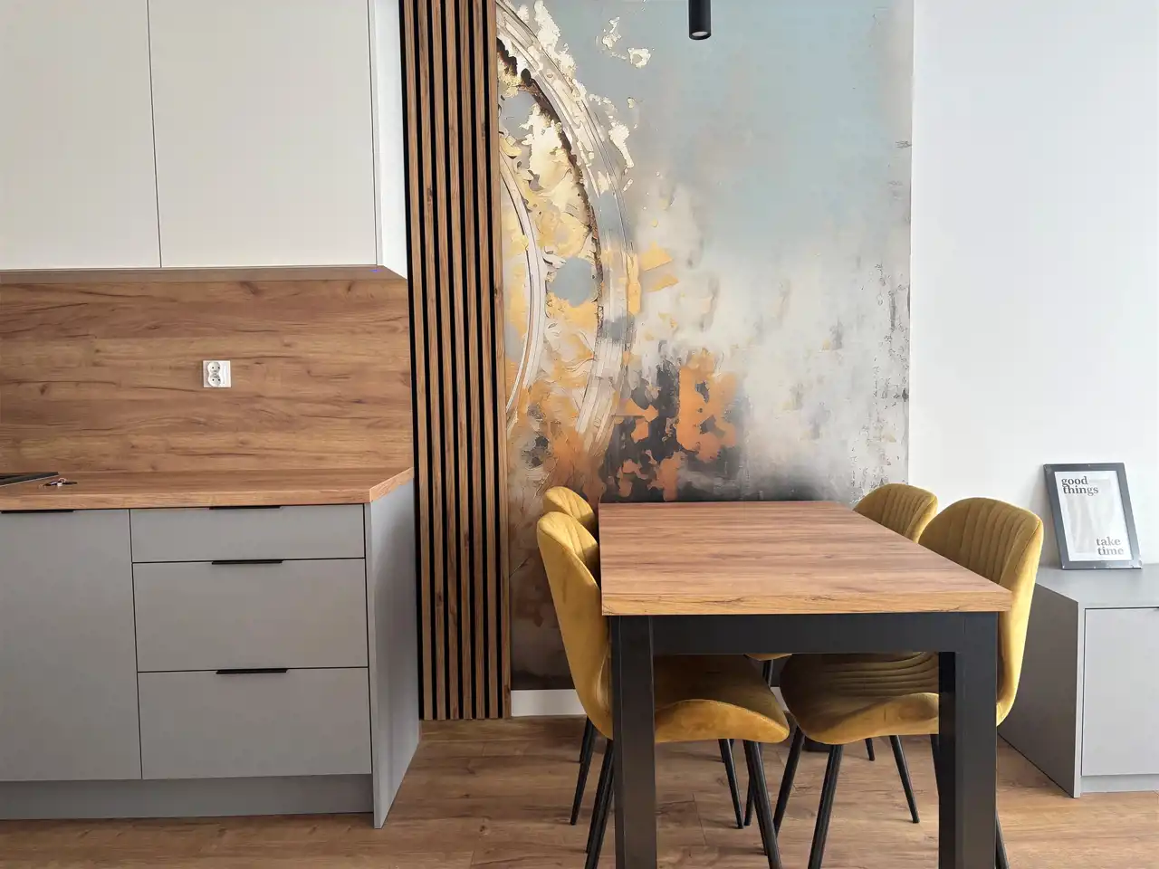 Wnętrze zostało urządzone z dbałością o detale aby wraz z meblami tworzyły piękną, spójną całość. Salon z kuchnią kuchnią to przestrzeń, która jest pięknie doświetlona naturalnym światłem i tworzy przyjemne miejsce zarówno do przyrządzania posiłków jak i spędzania czasu przed tv. Natomiast przestronna sypialnia tworzy idealne miejsce do wypoczynku i relaksu. Na ścianie nowoczesna fototapeta tworząca niepowtarzalny klimat.