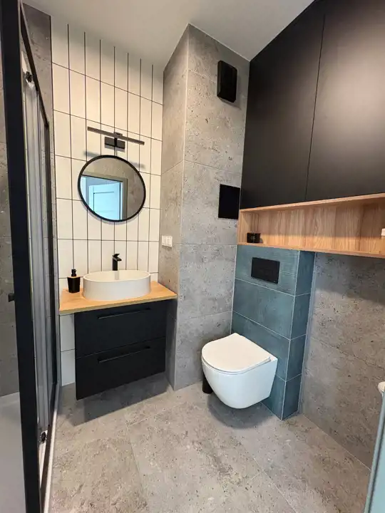 W łazience natomiast zadbano o każdy szczegół przez miejsce do przechowywania przez armaturę po wygodny prysznic. W przedpokoju zadbano o funkcjonalność poprzez dużą i pojemną zabudowę na wymiar gdzie umieścisz wierzchnią odzież.