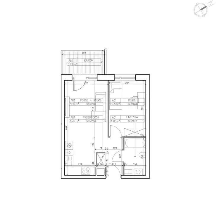 Mieszkanie składa się z pokoju dziennego z aneksem kuchennym, sypialni, łazienki i przedpokoju. Z salonu mamy wyjście na balkon o powierzchni 5,21m2.