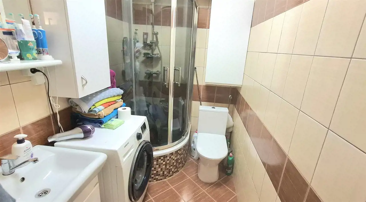 Kuchnia umeblowana z atrakcyjną zabudową i sprzętem AGD w kafelkach nowego typu. Łazienka również w kaflach z kabiną natryskową.