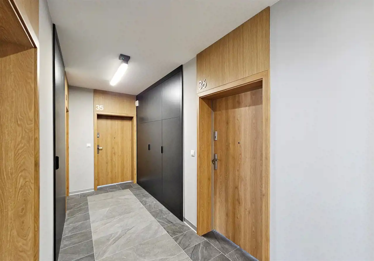 Budynki charakteryzują się postindustrialnym designem, gdzie części wspólne zasilane są instalacją fotowoltaiczną.