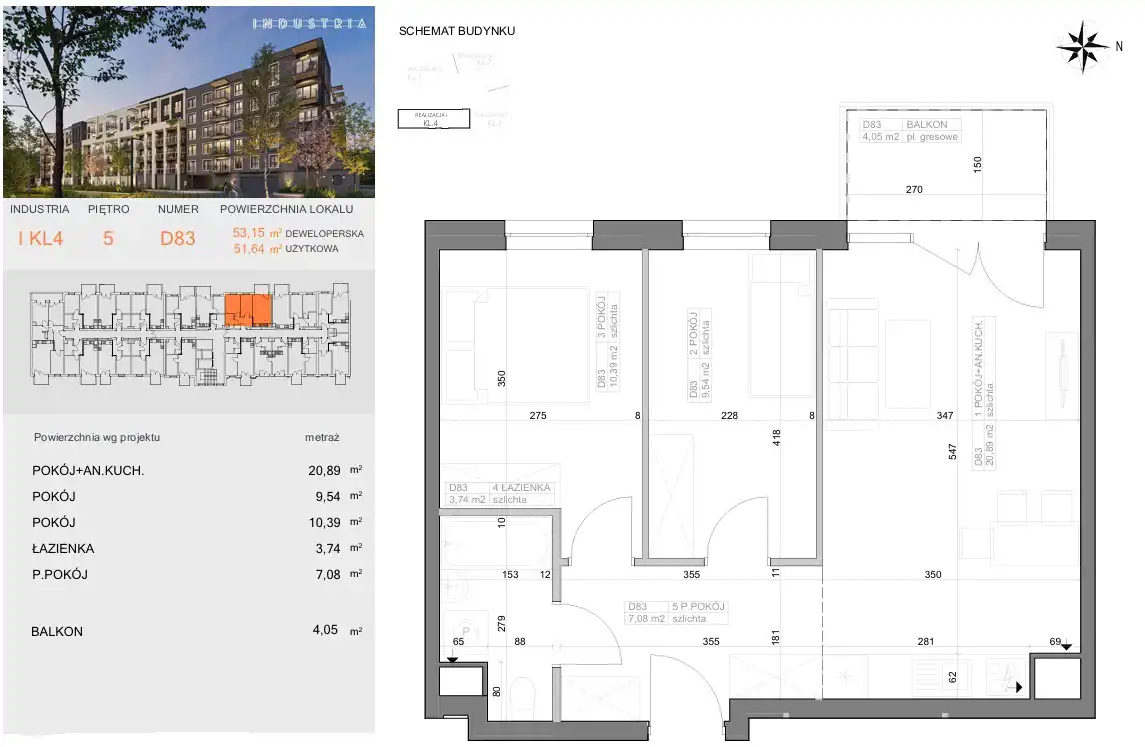 - Charakterystyka mieszkania 51.64 m2, 3 pokoje