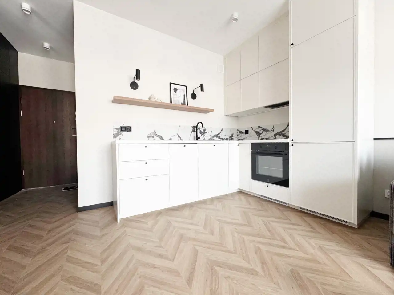 W aneksie kuchennym znajdziemy nowoczesną zabudowę ze sprzętem AGD (zmywarka, lodówka, płyta indukcyjna, piekarnik, okap), w łazience zostało przewidziane miejsce na pralkę, a w przedpokoju zrobiona została zabudowa.