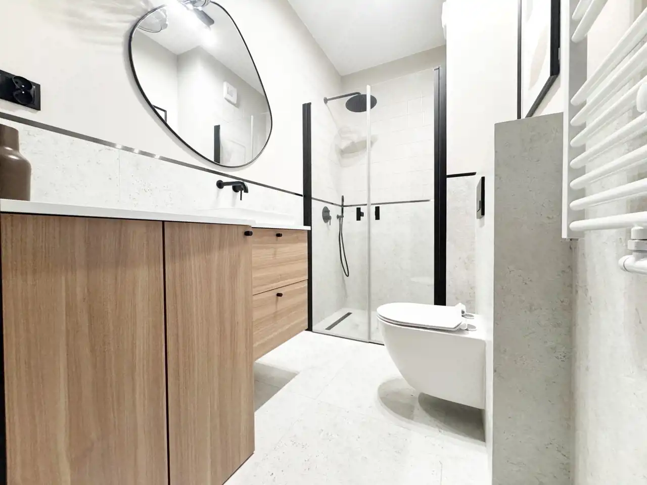 W mieszkaniu znajdziemy również łącze światłowodowe, videodomofon i klimatyzację.
