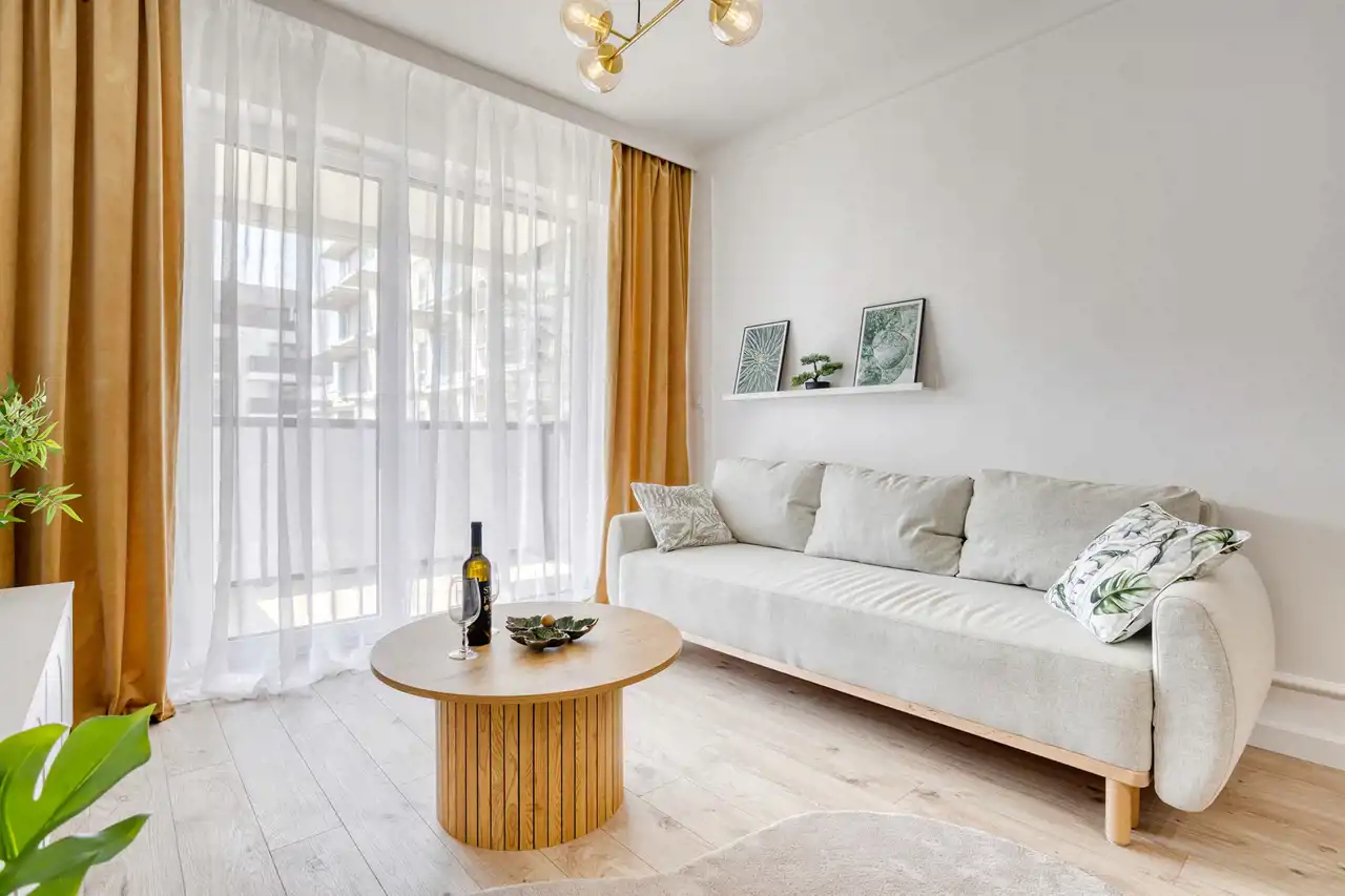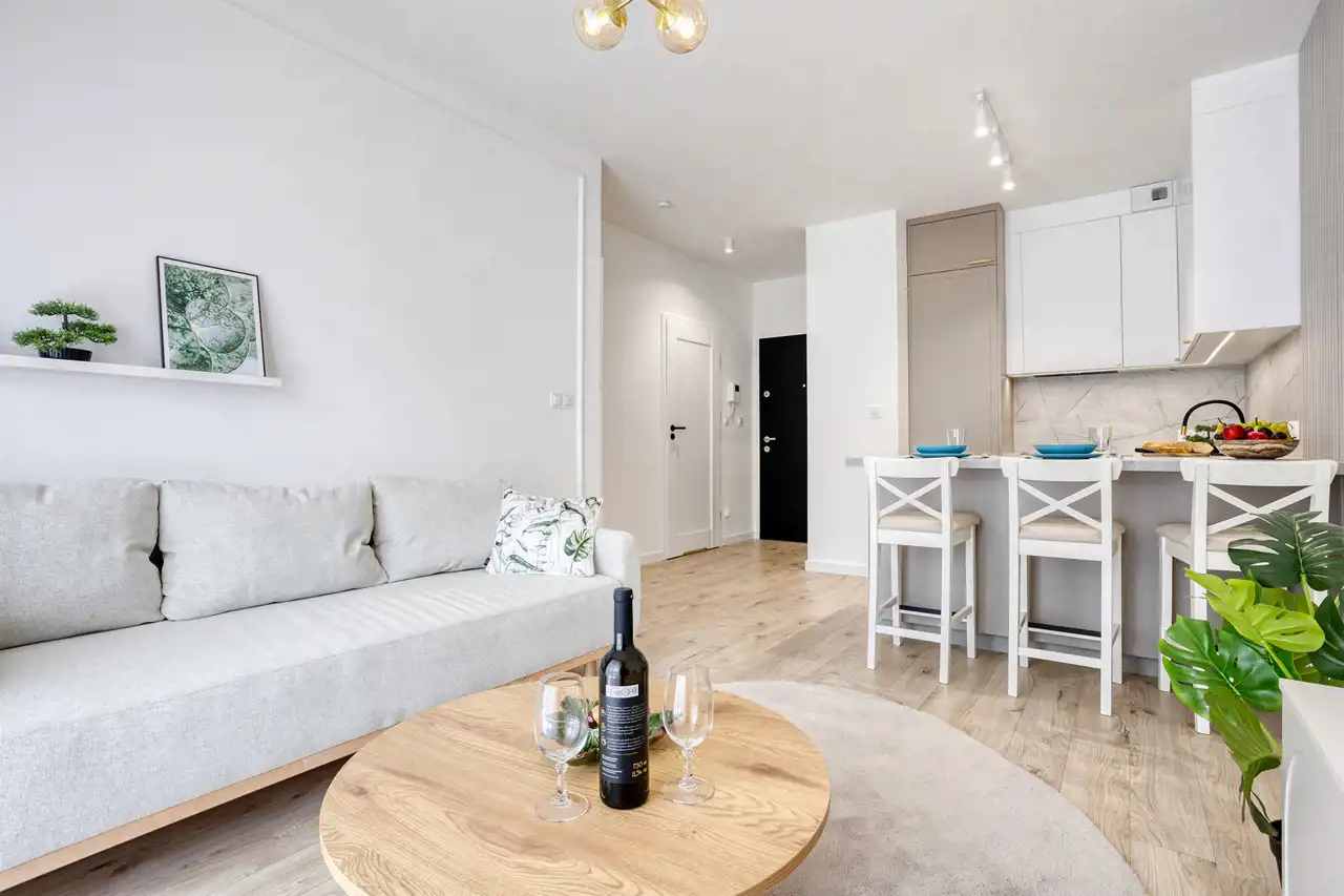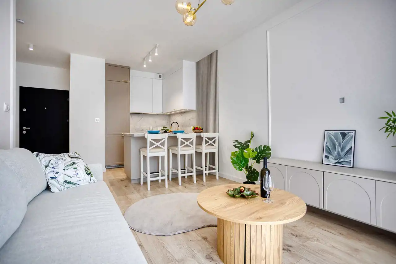 To komfortowe wnętrze stworzone dla wszystkich którzy cenią nowoczesność w zestawieniu z przytulnością. Jasna kolorystyka mebli połączona z lustrami i drewnem sprawia, że jest tu bardzo przyjemne. Atutem jest również przemyślane oświetlenie z podziałem na strefy co doceni każdy kto lubi czytać lub musi pracować w domu a wieczorem chce się zrelaksować i stworzyć nieco przygaszony klimat idealny na romantyczną kolację.