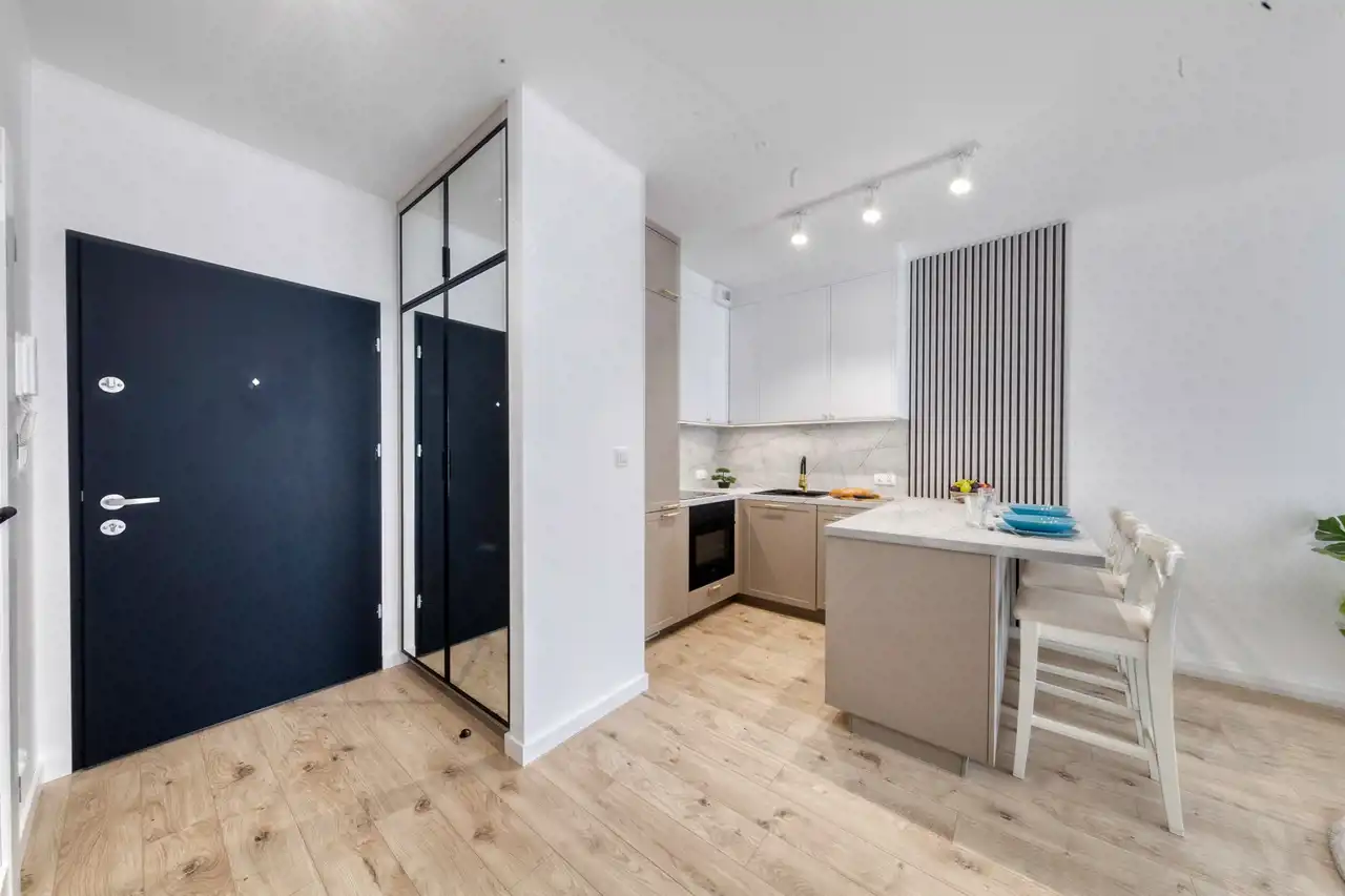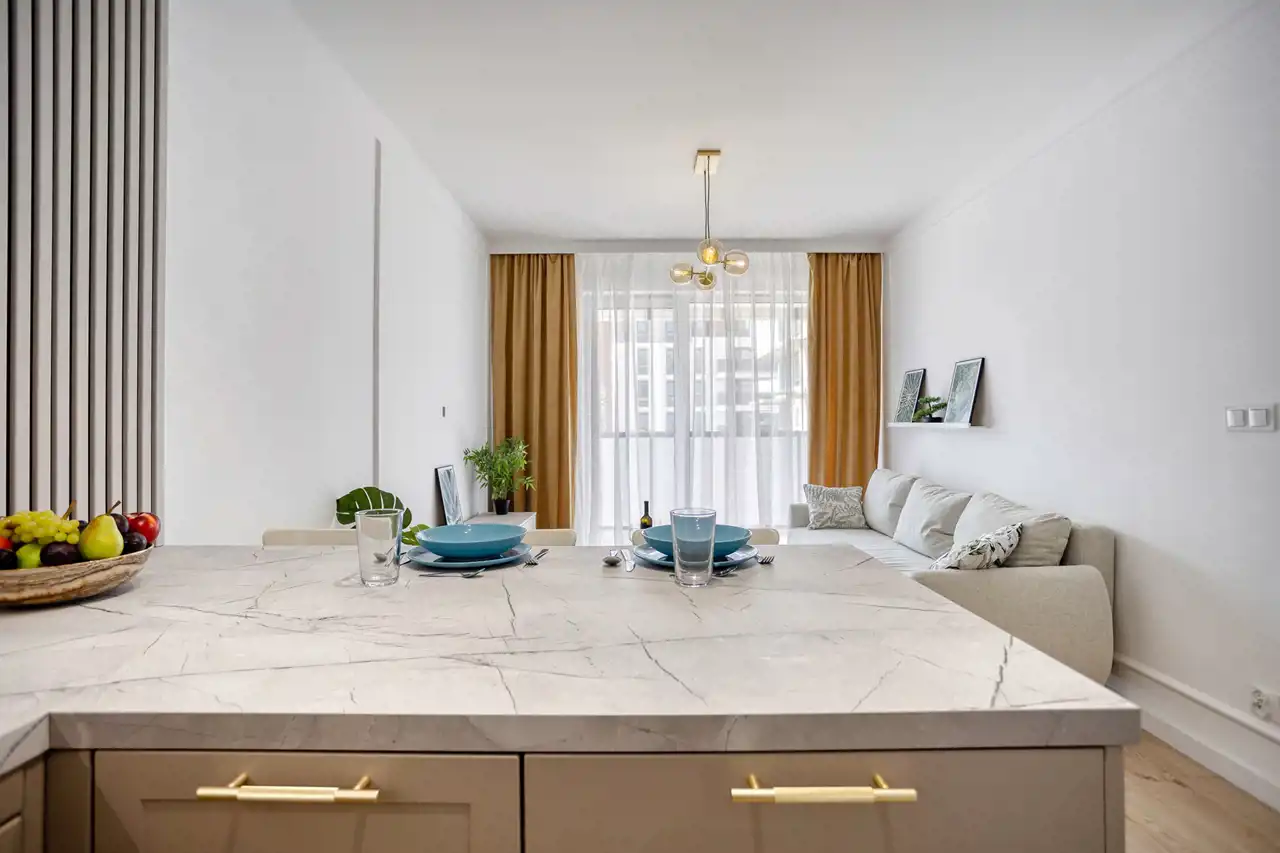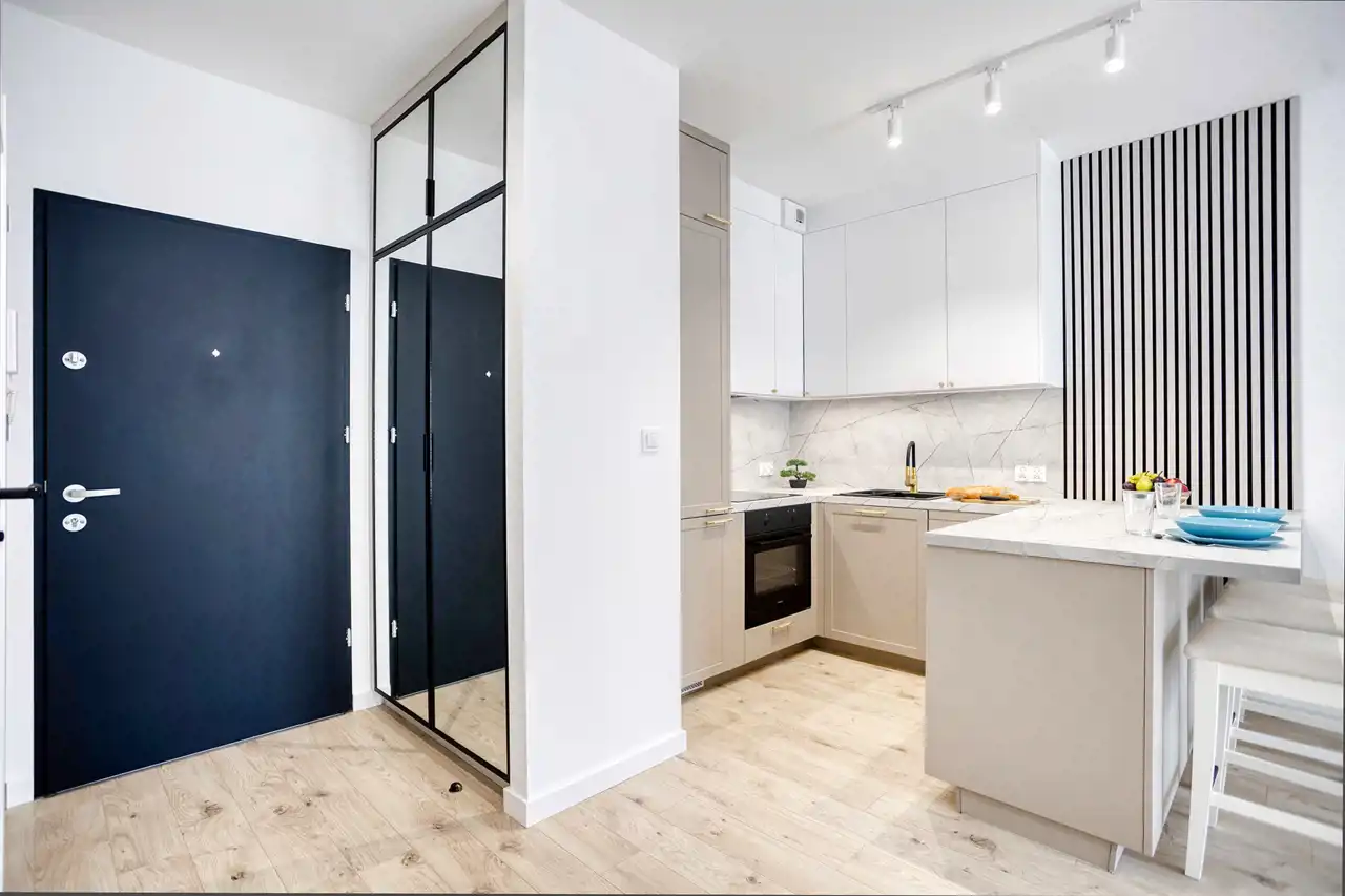 To komfortowe wnętrze stworzone dla wszystkich którzy cenią nowoczesność w zestawieniu z przytulnością. Jasna kolorystyka mebli połączona z lustrami i drewnem sprawia, że jest tu bardzo przyjemne. Atutem jest również przemyślane oświetlenie z podziałem na strefy co doceni każdy kto lubi czytać lub musi pracować w domu a wieczorem chce się zrelaksować i stworzyć nieco przygaszony klimat idealny na romantyczną kolację.