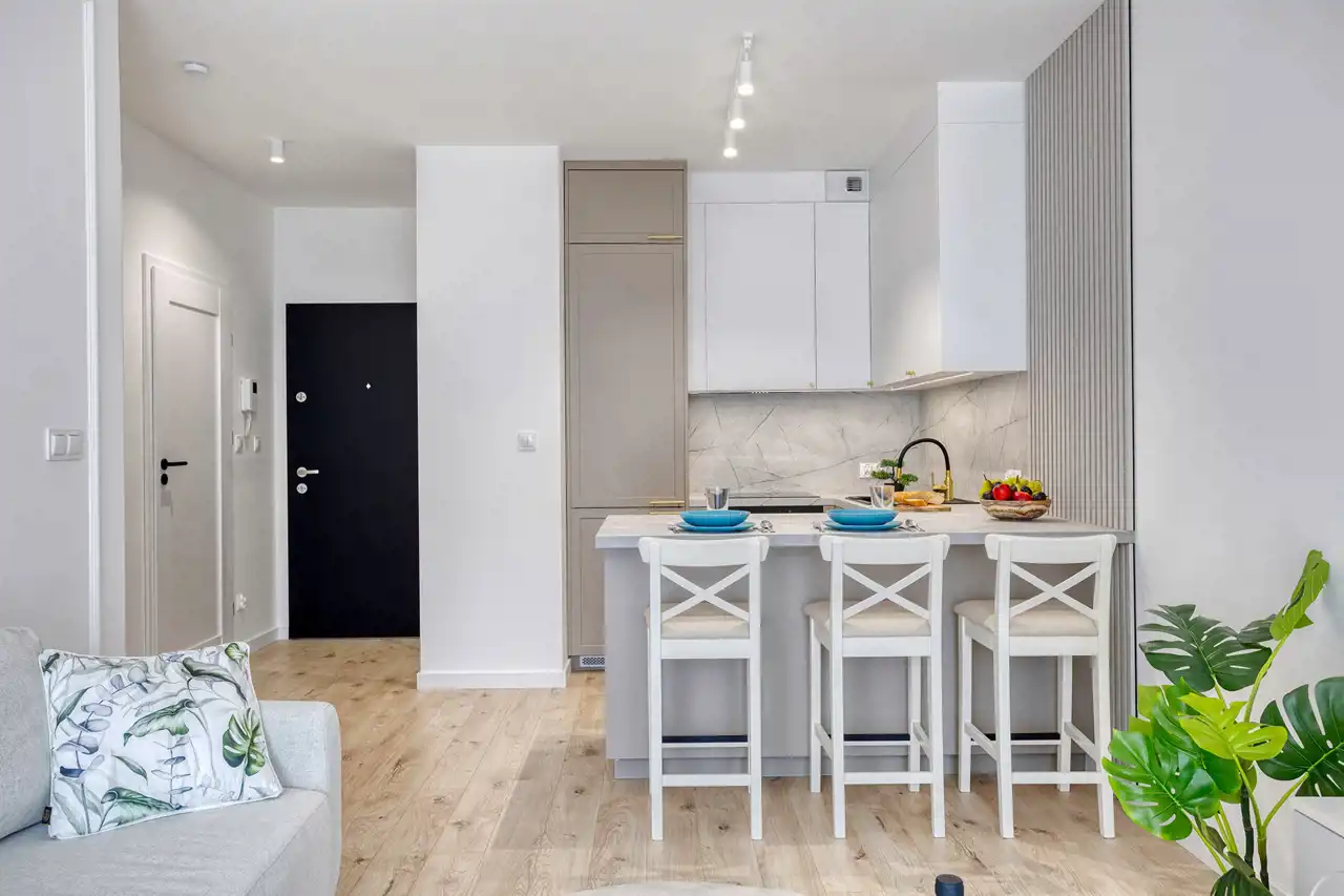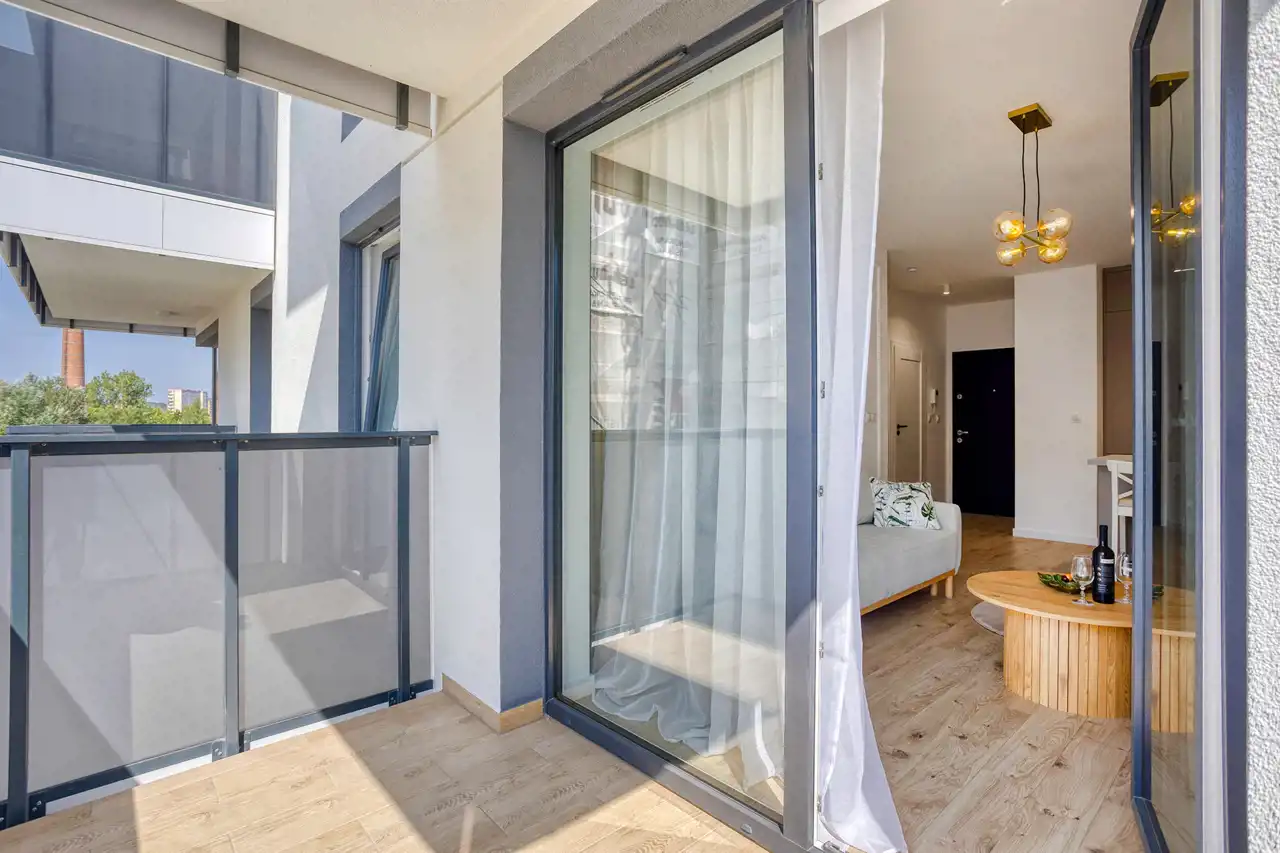 - salon z kuchnią oraz wyjściem na duży balkon