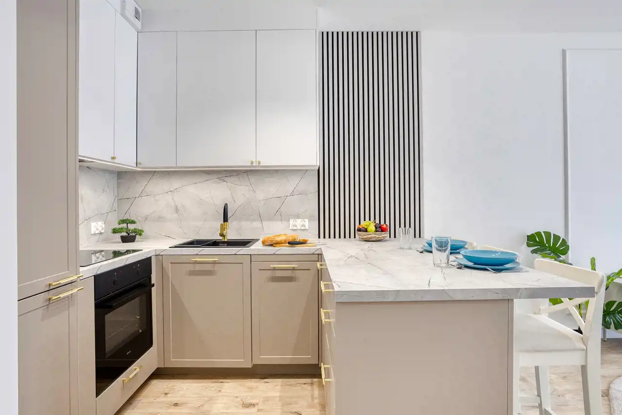 Kuchnia z wyspą roboczą pozwala wygodnie przygotować posiłki i jednocześnie zapewnia wiele miejsca do przechowywania naczyń. Nowe sprzęty AGD są w cenie.
