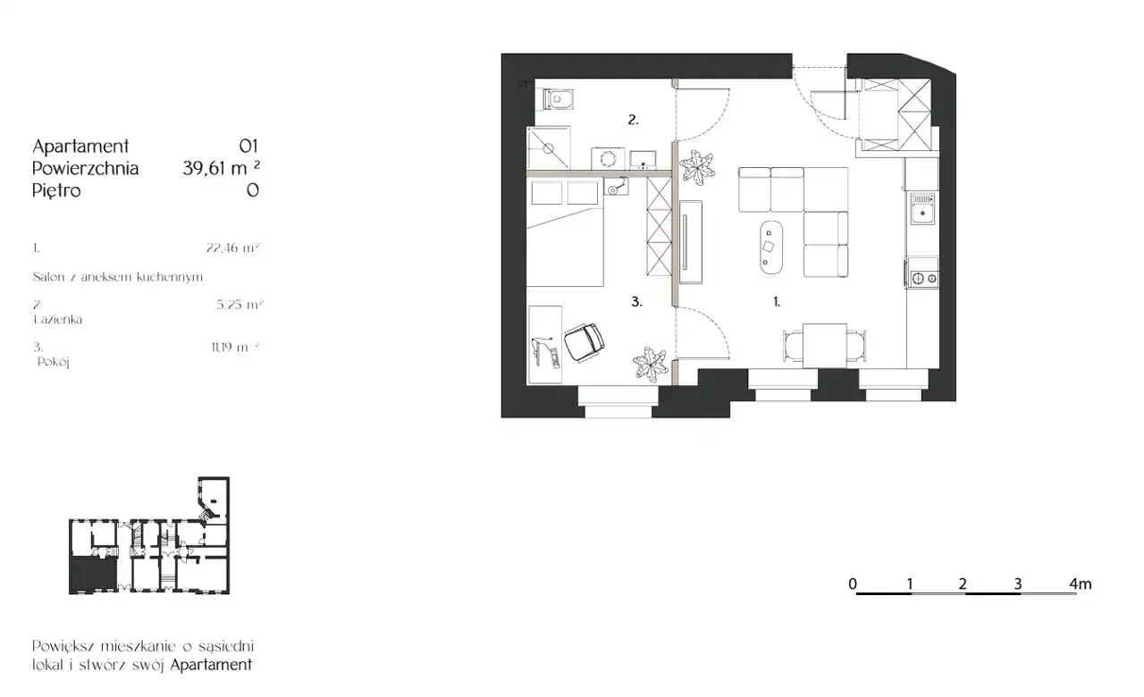 - Charakterystyka mieszkania 39.61 m2, 2 pokoje