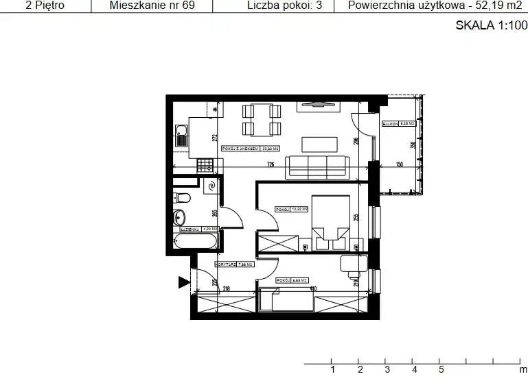 - Charakterystyka mieszkania 52.19 m2, 3 pokoje