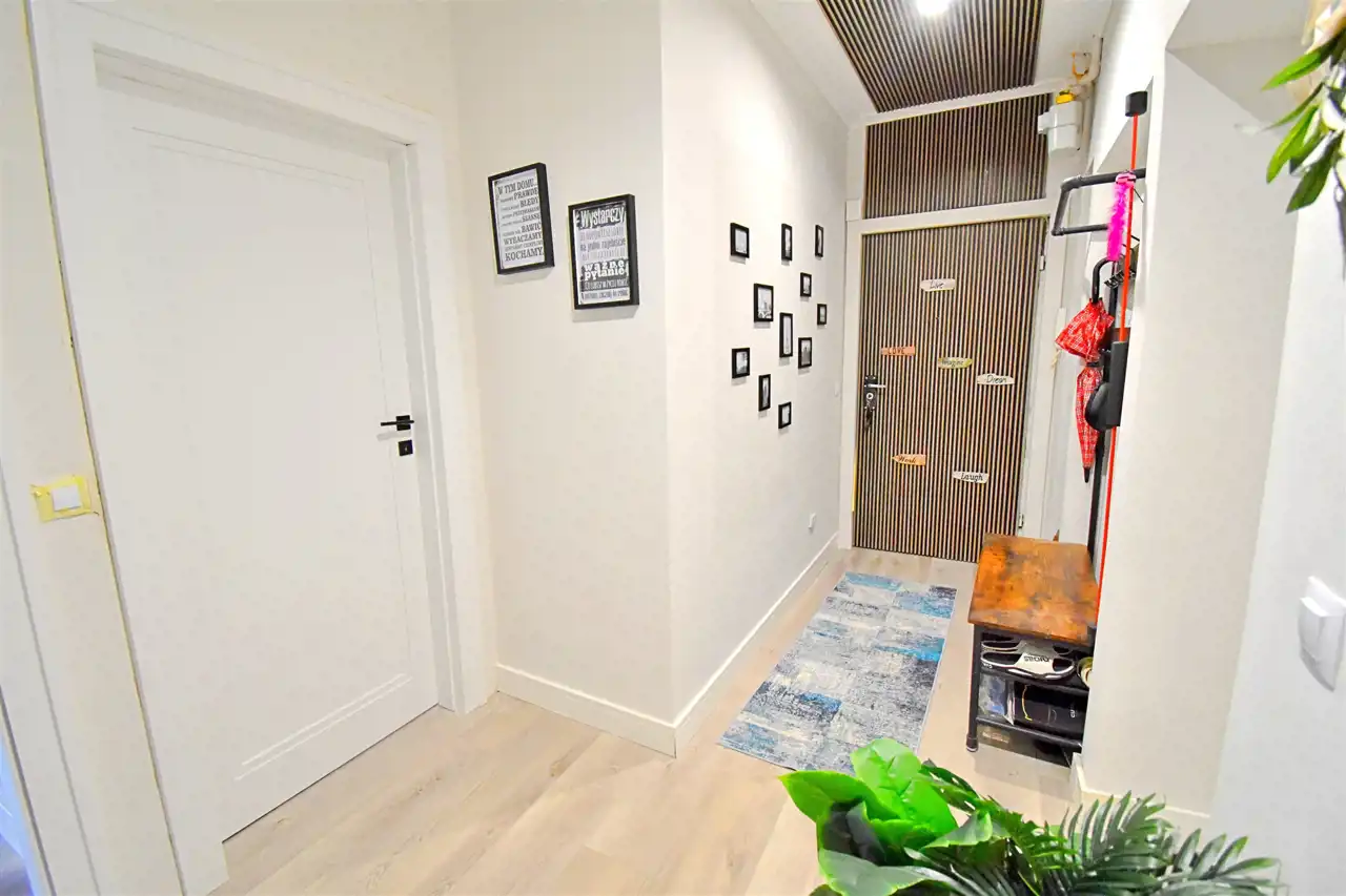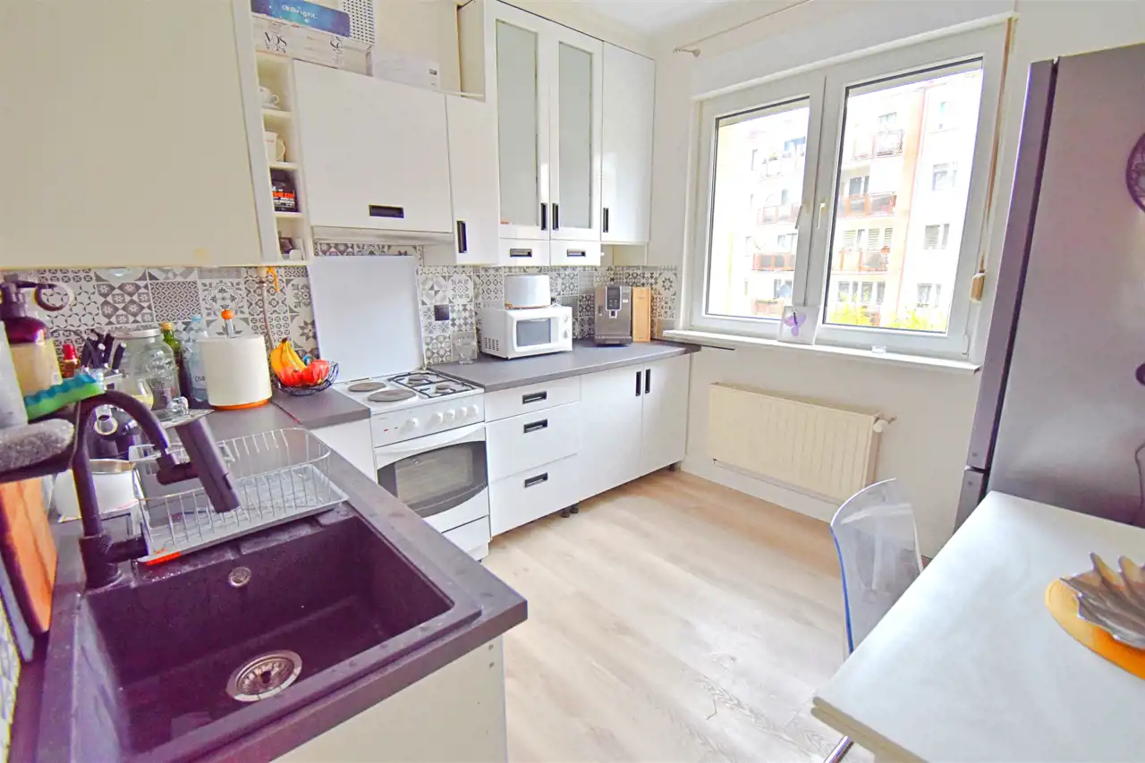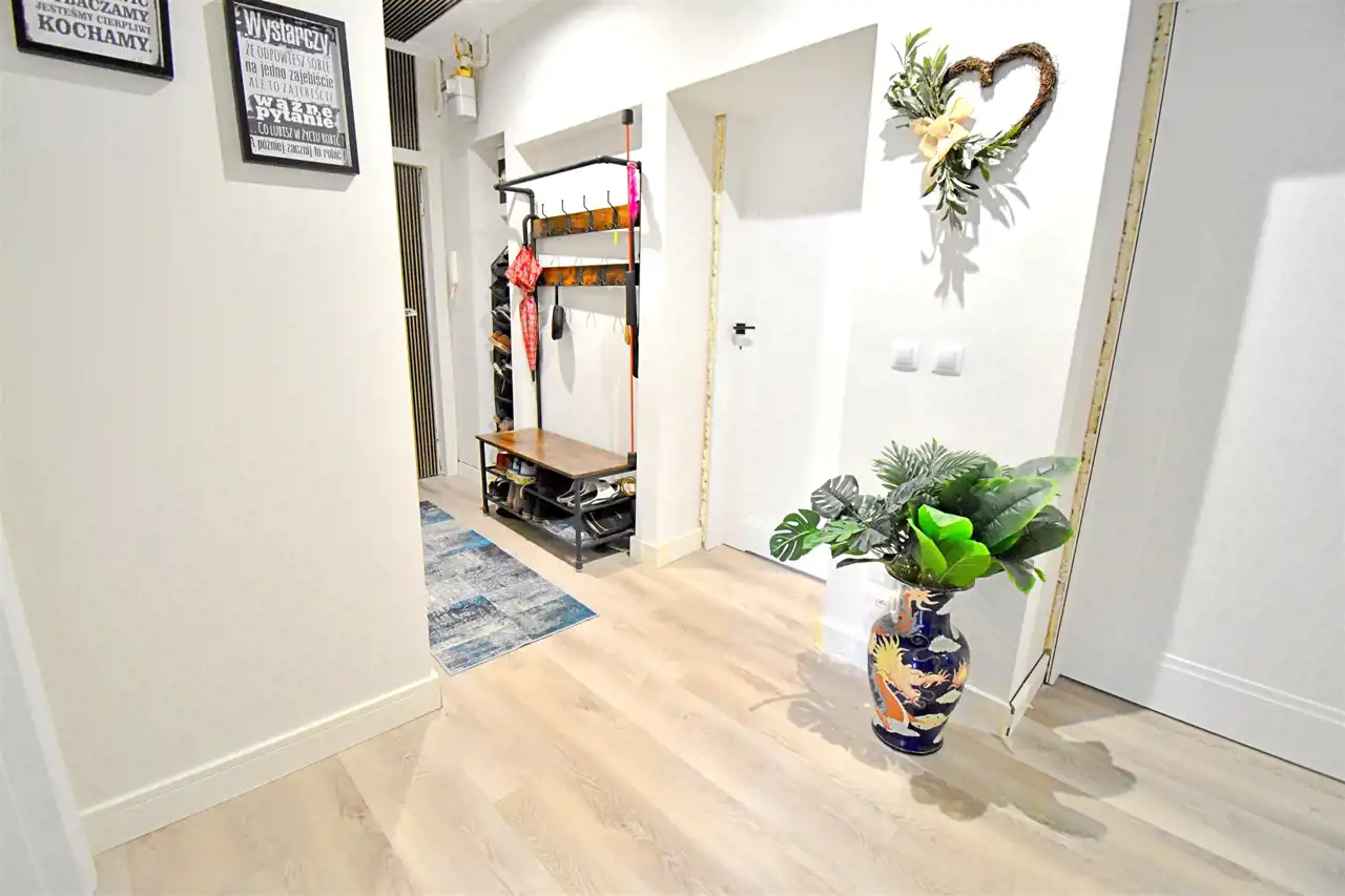 Lokal jest po generalnym remoncie podczas którego we wszystkich pokojach z wysoką starannością wykonano gładzie, położone zostały panele klasy premium firmy Parador. W przedpokoju i kuchni podłoga winylowa klasy premium o grubości 8 mm, z podkładem akustycznym zintegrowanym, drzwi wewnętrzne stylizowane w Ral 9003, białe w klasie premium, wersja bezprzylgowa. Drzwi wejściowe antywłamaniowe firmy Gerda. Kuchnia zyskała nowy look, nowe blaty, wyposażenie, zmywarka Whirpool, duża lodówka Grundig. Położone zostały płytki w pasie roboczym. ŁAzienka przeszła generalny remont dwa lata temu, podczas którego wymienione zostały również instalacje elektryczne i wodno-kanalizacyjne. Dodatkowo w całym mieszkaniu położono sztukaterię przysufitową oraz listwy podłogowe o wysokości 11,5 cm wykończone w RAL 9003, białe.