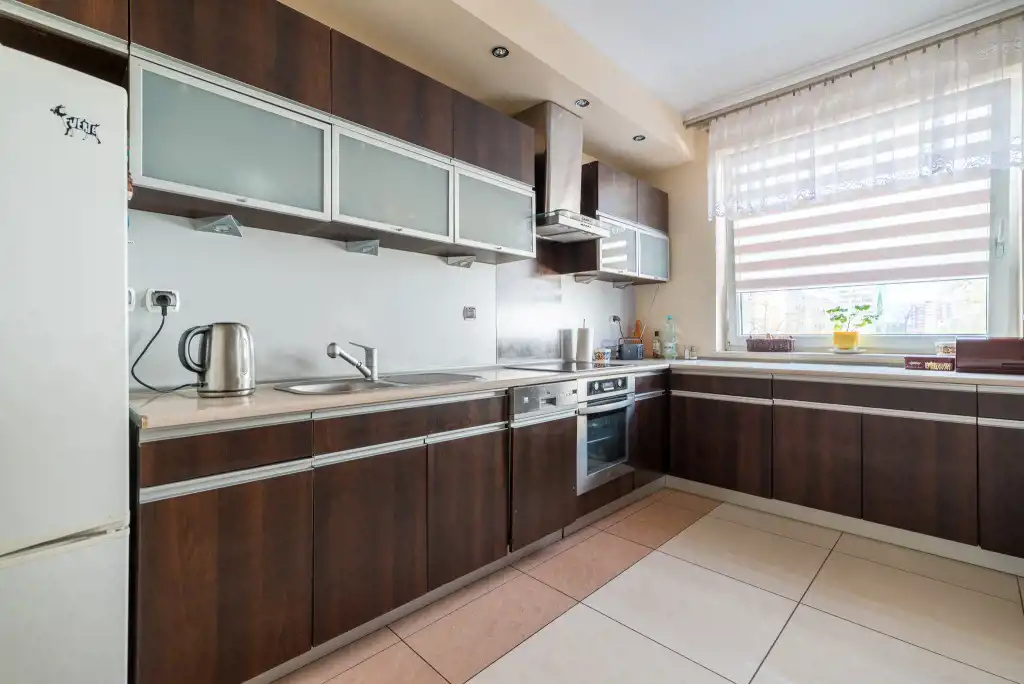 Duża kuchnia w zabudowie ze sprzętem agd ( zmywarka, kuchenka, piekarnik), na podłodze duże kafle, na ścianach gładź.