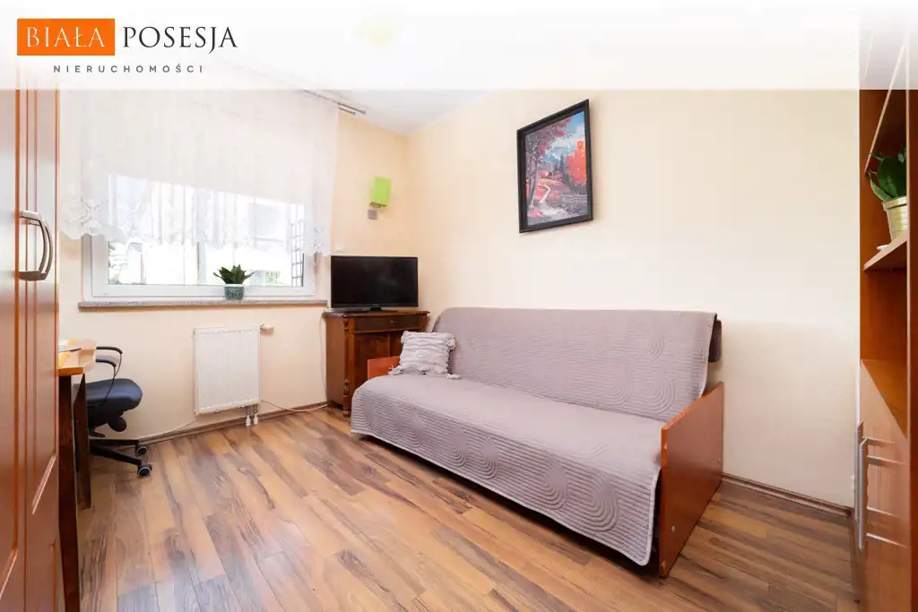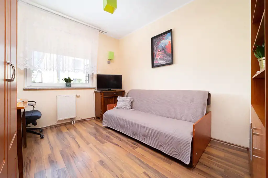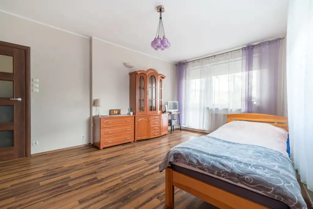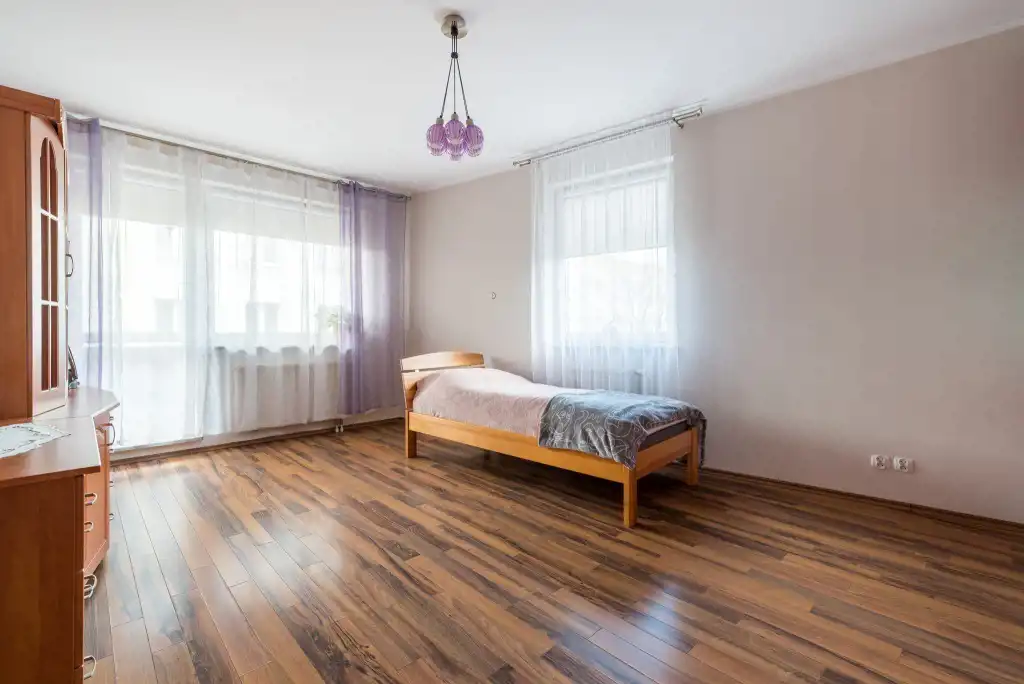 W pokojach na podłodze panele, na ścianach gładź. W większej sypialni znajduje się szafa 3-drzwiowa w zabudowie, na dwóch ścianach okna w tym wyjście na wygodny balkon.
