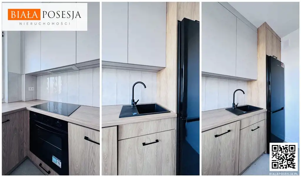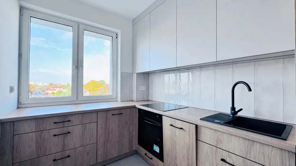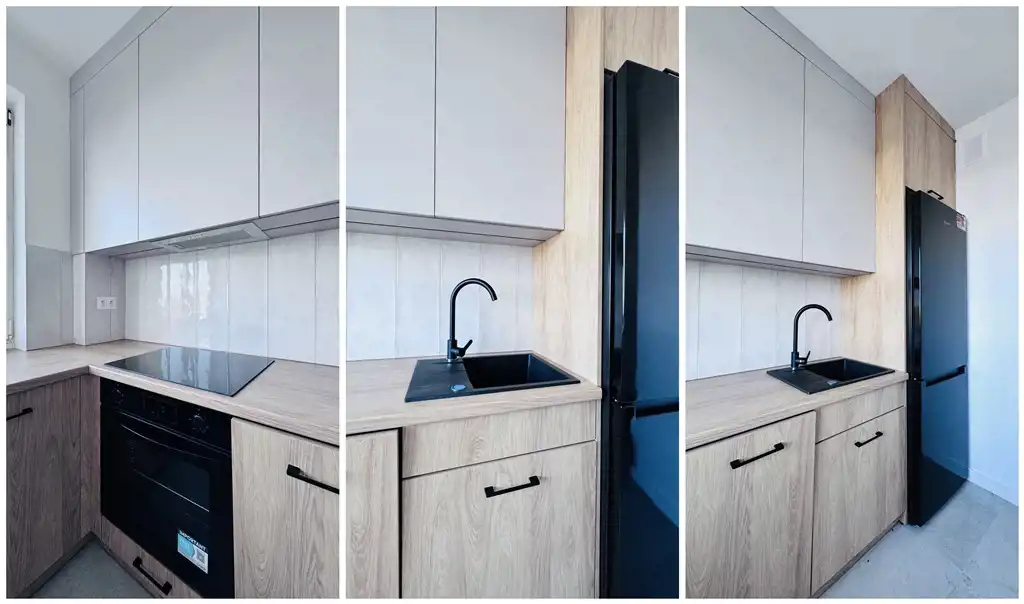 - jasna kuchnia 6 m² z nową zabudową na wymiar i sprzętem AGD,