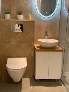 W łazience pralka, kabina prysznicowa, na ścianach nowoczesne płytki w odcieniach szarości, beżu,bieli.