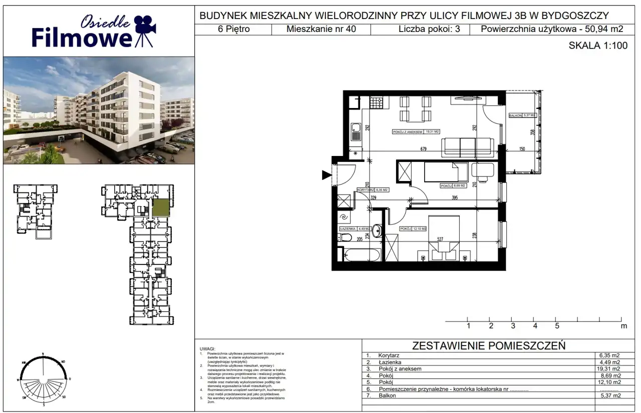 - Charakterystyka mieszkania 50.94 m2, 3 pokoje
